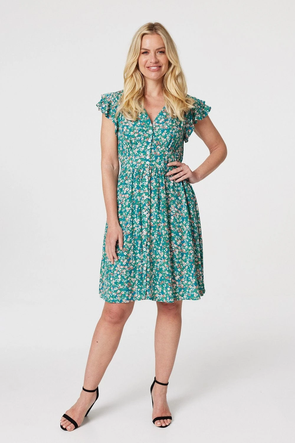 Add a pretty floral print to your warm weather wardrobe with this frilled sleeve skater dress. It has a v-neck with a button front, a shirred waist , short cap sleeves with a ruffle detail, handy pockets and a short skirt sitting just above the knee. Made from 100% viscose its both lightweight and breathable. Pair with strappy block heels for a chic feminine style.