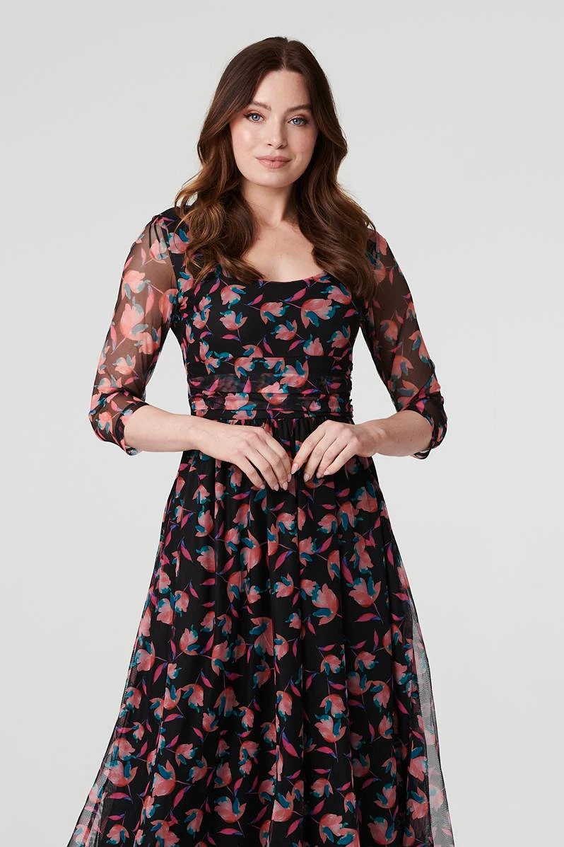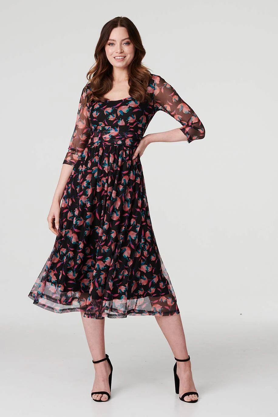 For your next formal event, dress to impress in this beautiful midi featuring a mesh semi sheer layer with ruched details at the waist. It has 3/4 sleeves and a round neck, along with a midi length layered hem that will look stunning as you twirl on the dance floor at a wedding or party.