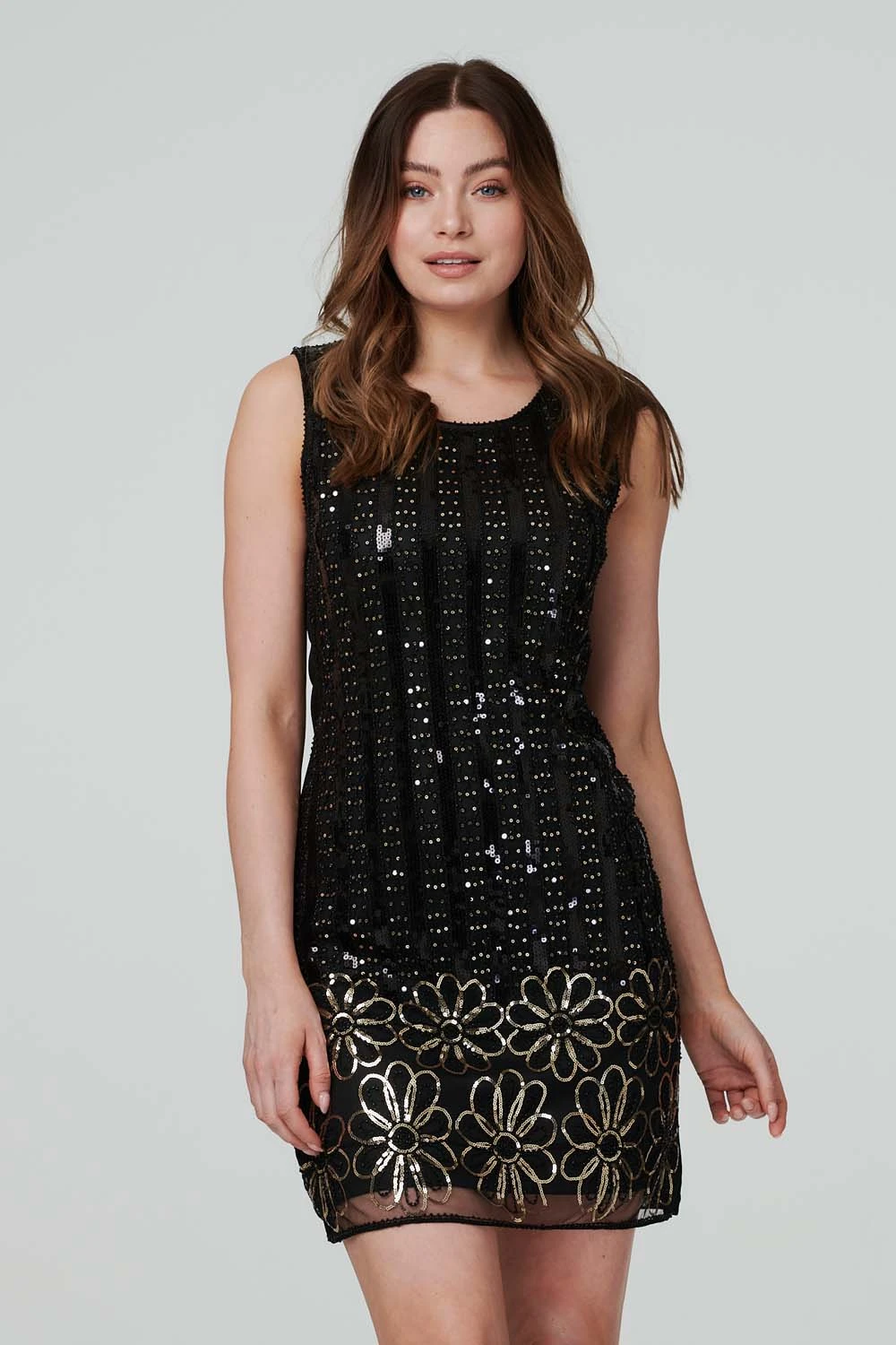 Make a statement in this sequin embellished floral shift dress. With a round neck, a sleeveless fit, an embellished front overlay and a slim fitting mini skirt. Style with gold heels and a satin clutch bag for an elegant party look.