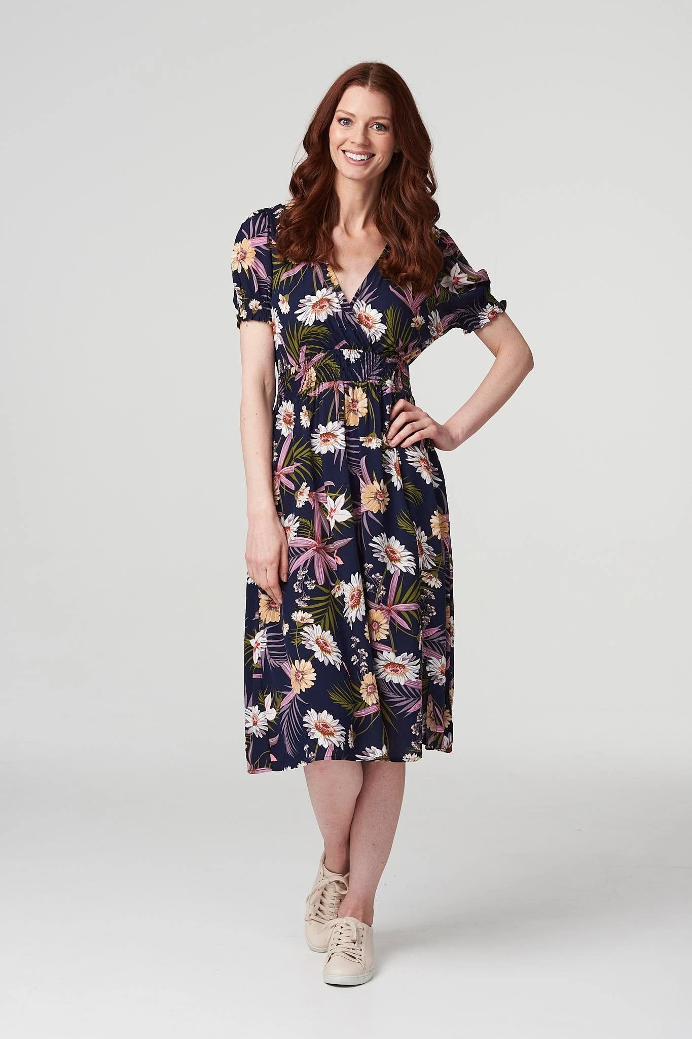Every warm weather wardrobe needs a striking floral print like this pretty midi dress. Made from 100% viscose, it has a v-neck, wrap front, shirred waist, short sleeves with shirred cuffs, pockets and a midi hem falling just below the knee. Pair with neutral heels for a chic style you can wear for lunch in the sunshine with friends.