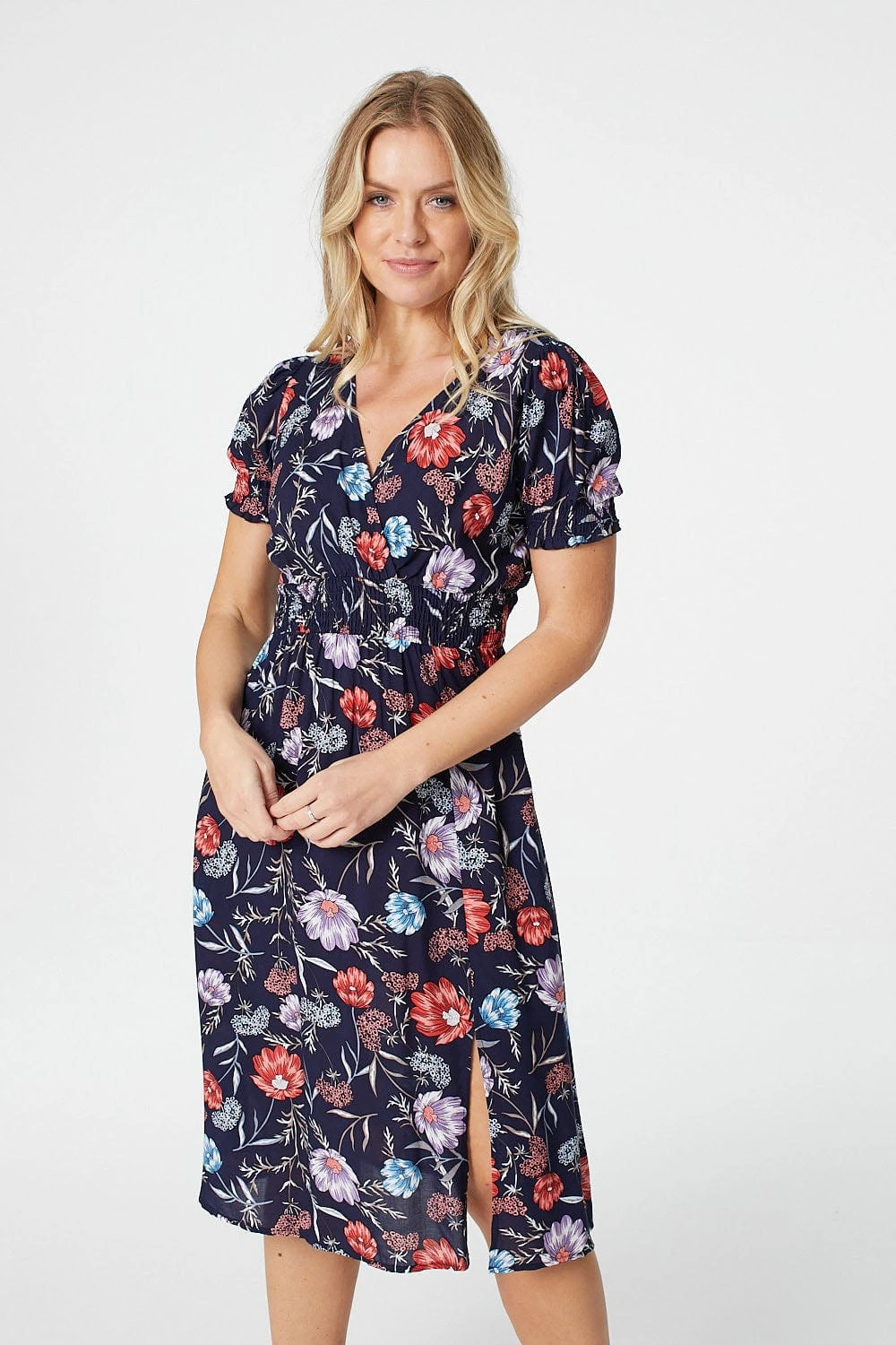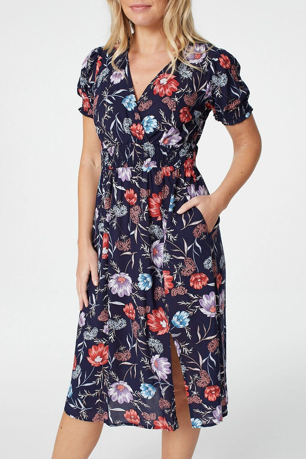 Every collection needs a versatile midi dress like this floral tea dress. With a v-neck, short sleeves, a flattering shirred waist, pockets, a front split detail and a midi length skirt. Pair with low blush heels for a simple outfit perfect for everyday of the week.