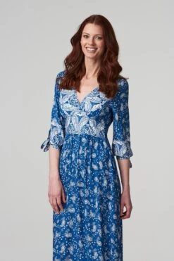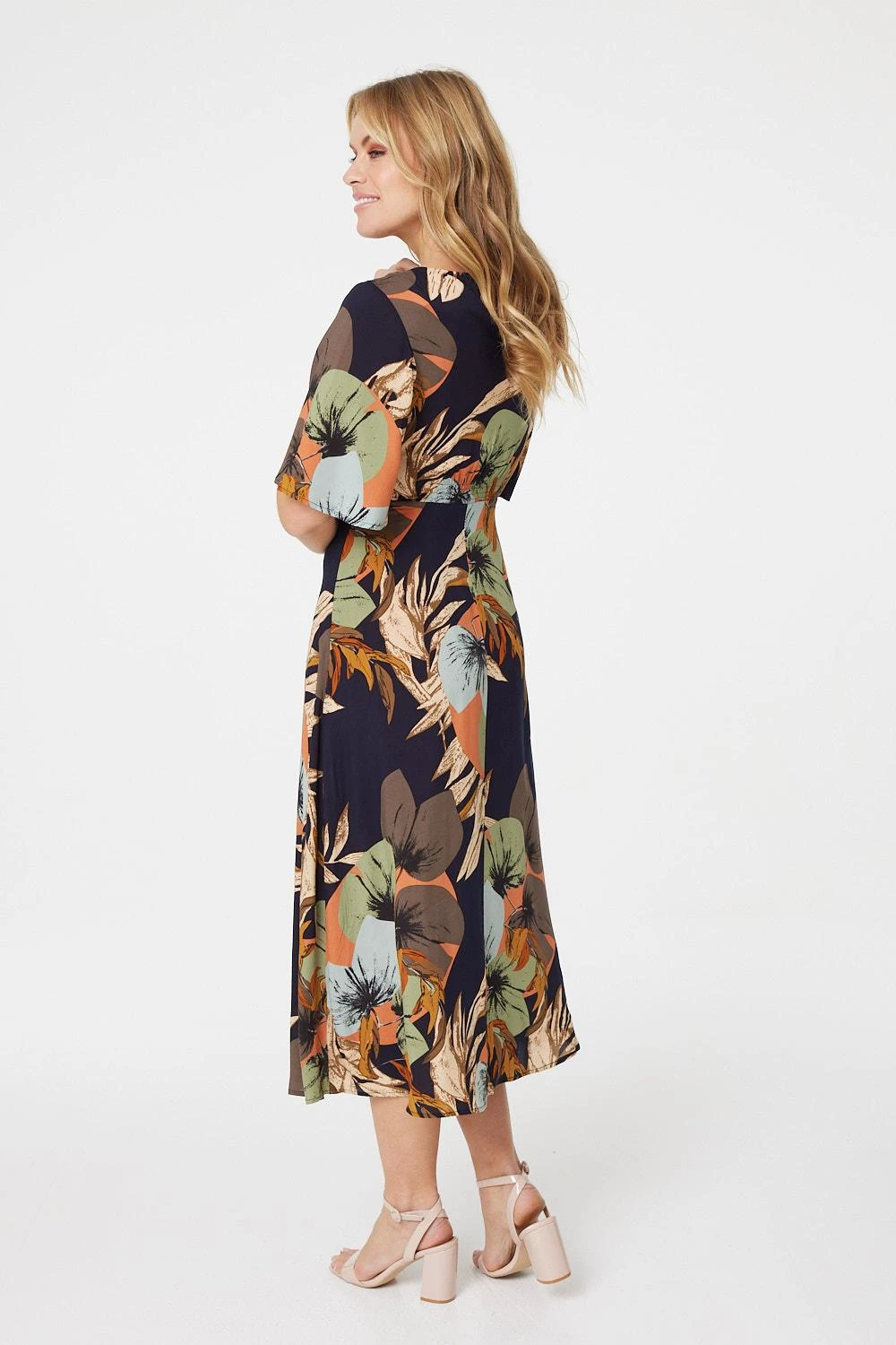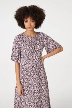 Make a statement this summer by adding a bold print to your dress collection like this stylish floral midi. With a round neck, a fitted waist with elegant shirred detailing, a side zip closure, keyhole back and flattering flared sleeves. Style with some strappy heeled sandals to make the perfect look for an al fresco brunch with friends.