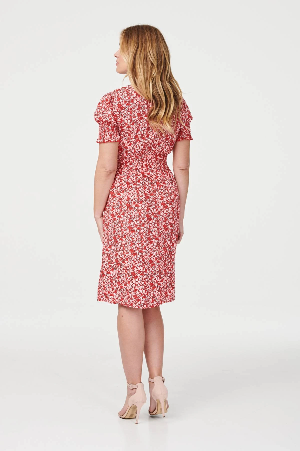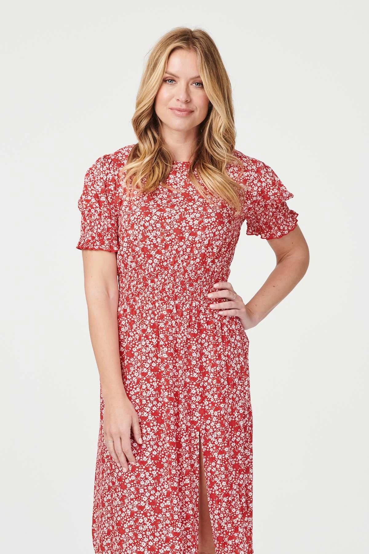 Your new season closet needs a flattering floral tea dress like this midi. With a round neck, short puff sleeves, a smocked waist, a straight skirt with a side split detail and knee length fit. Dress up for a daytime event with nude heels.
