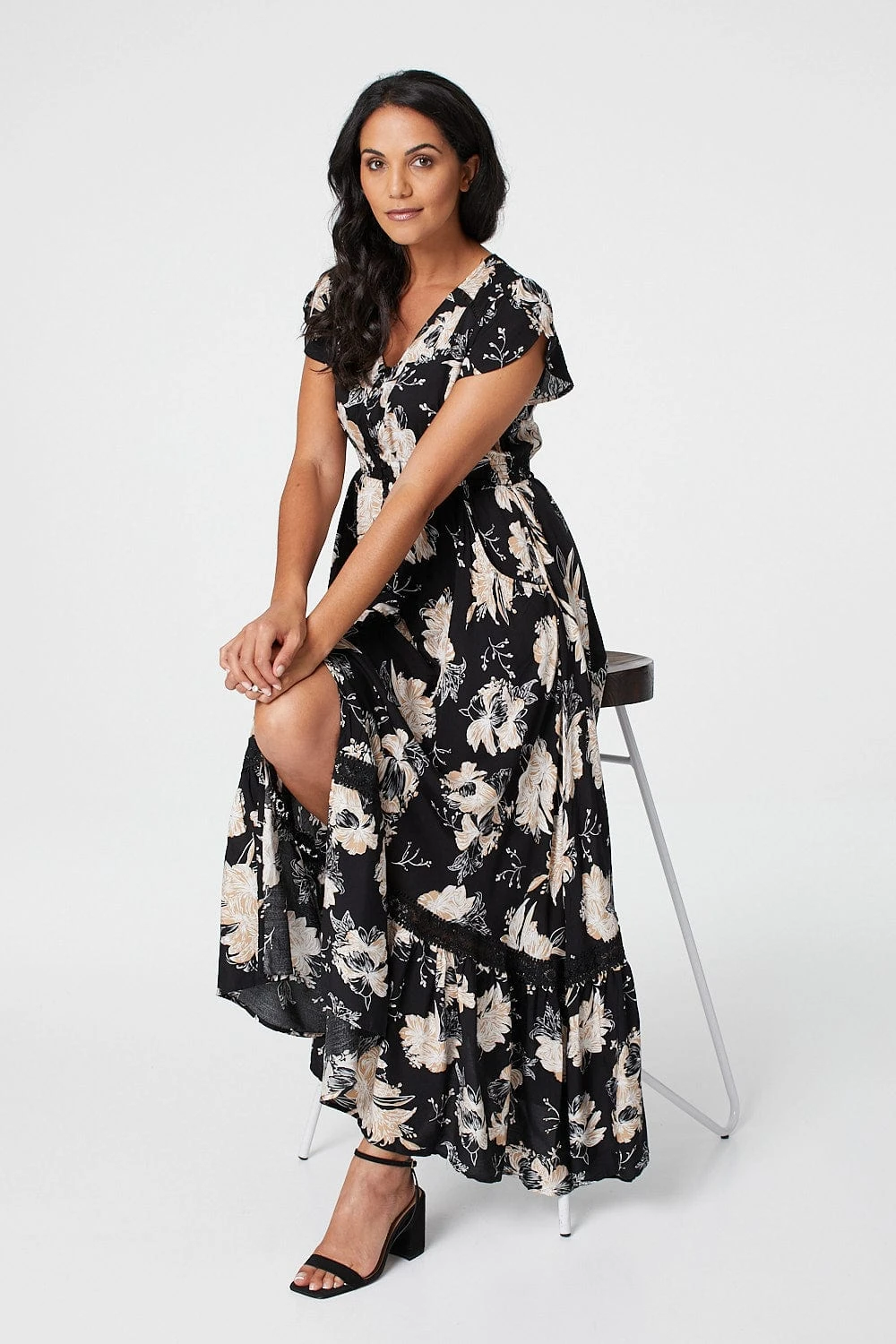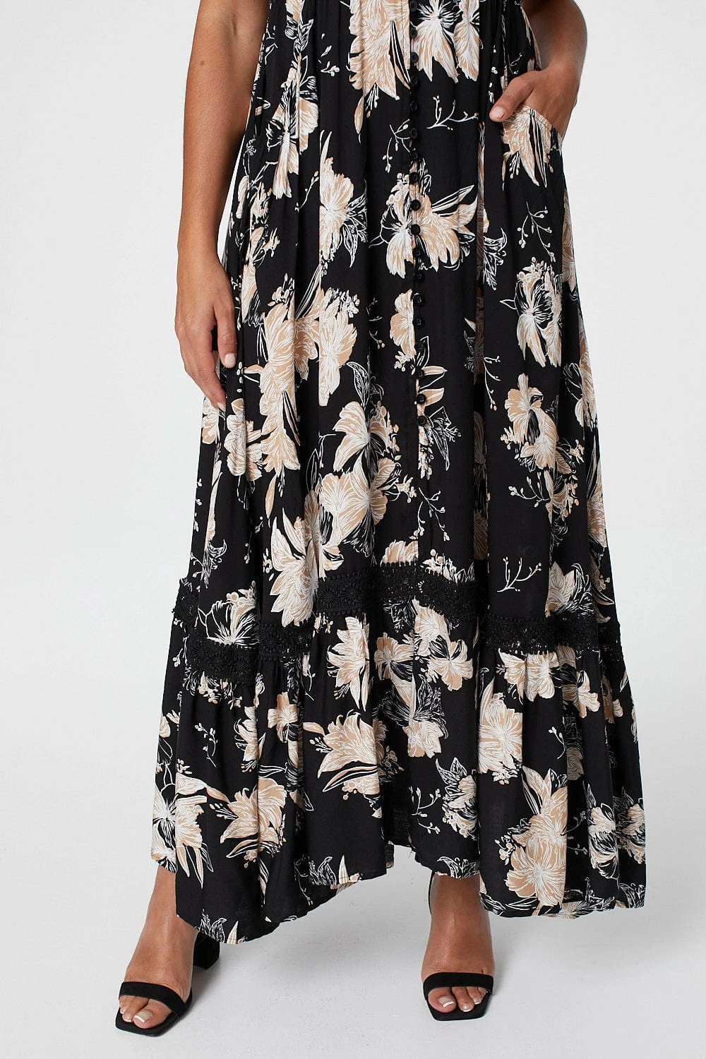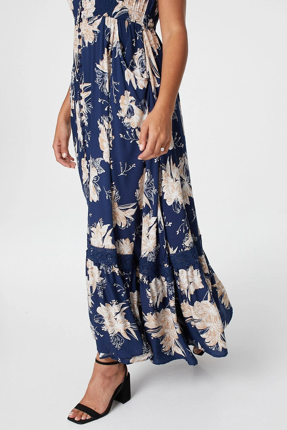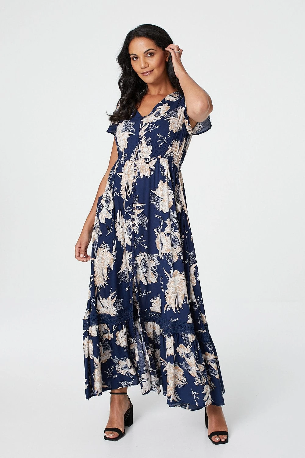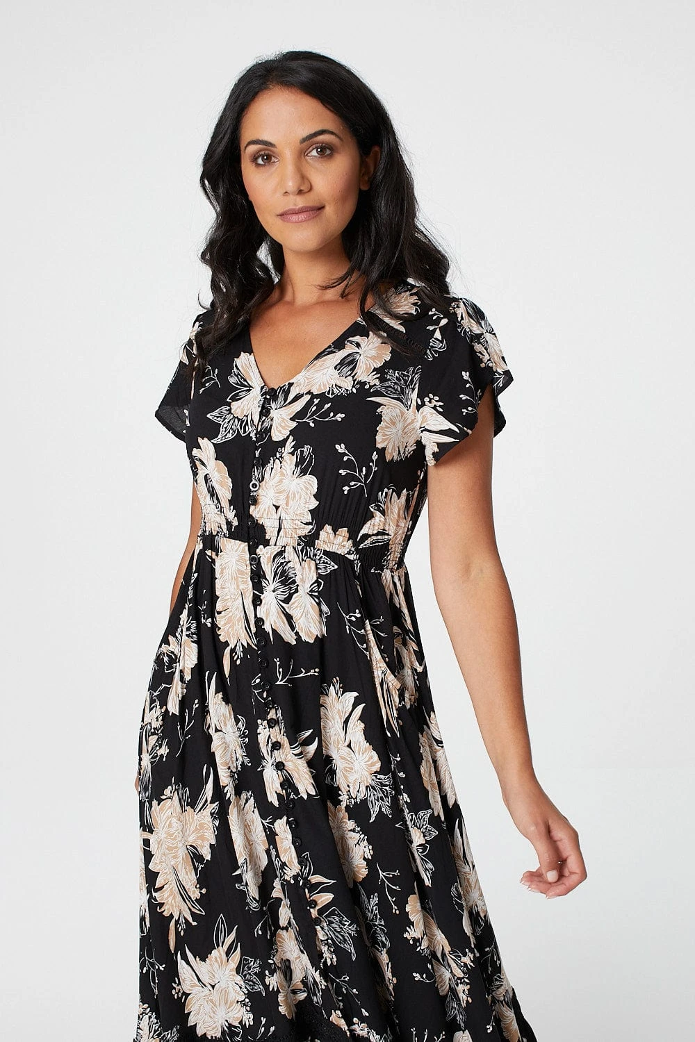 Add a statement making floral maxi dress to you closet with this button front style. With a v-neck, short sleeves, button detailing, pockets, a full tiered skirt and a maxi length. Pair with blush heels for a sophisticated wedding guest look.