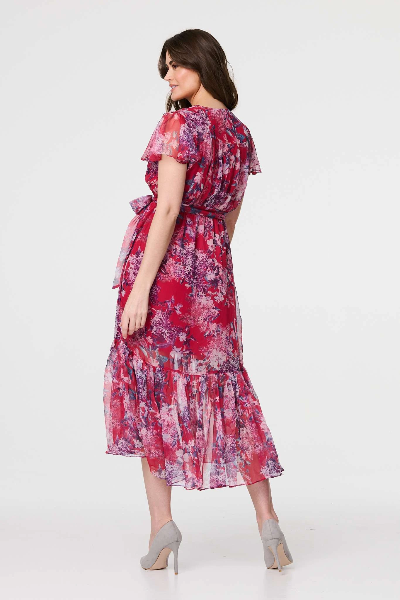 Stand out from the crowd in this stunning floral midi dress. With a v-neck, short frilled sleeves with a semi sheer detail, a tie waist and a tiered full skirt sitting below the knee. Dress up with heels for a formal event or dress down with flip flops on holiday.