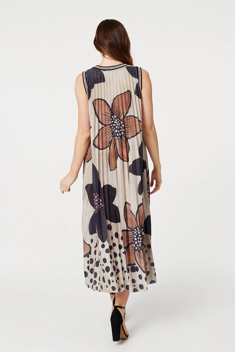 Every capsule closet needs a relaxed fit warm weather dress like this floral pleated maxi. It has a round neck, sleeveless fit, an oversized silhouette and a maxi length hem. Pair with neutral heels for a chic yet comfortable style.