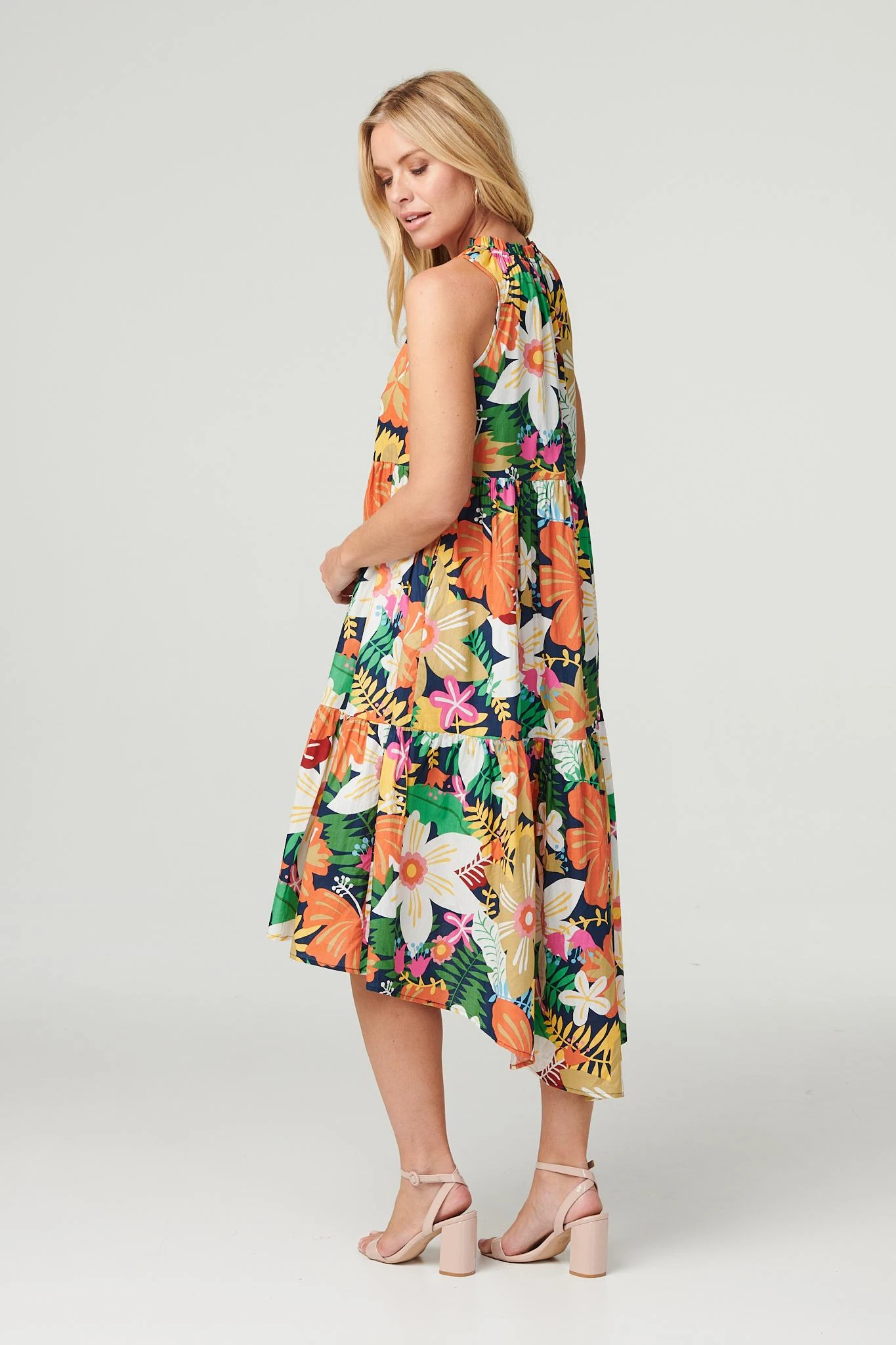 Add a bold floral print to your dress collection with this versatile midi dress. It has a frilled high neck, a sleeveless fit and a tiered high-low midi length hem. Made from 100% breathable cotton it’s the perfect addition to a holiday wardrobe. Pair with heeled sandals for a chic warm weather style.
