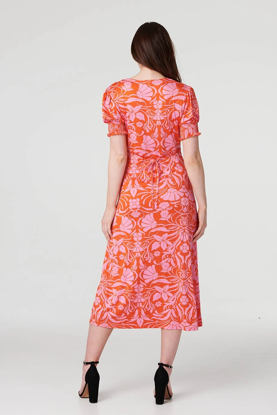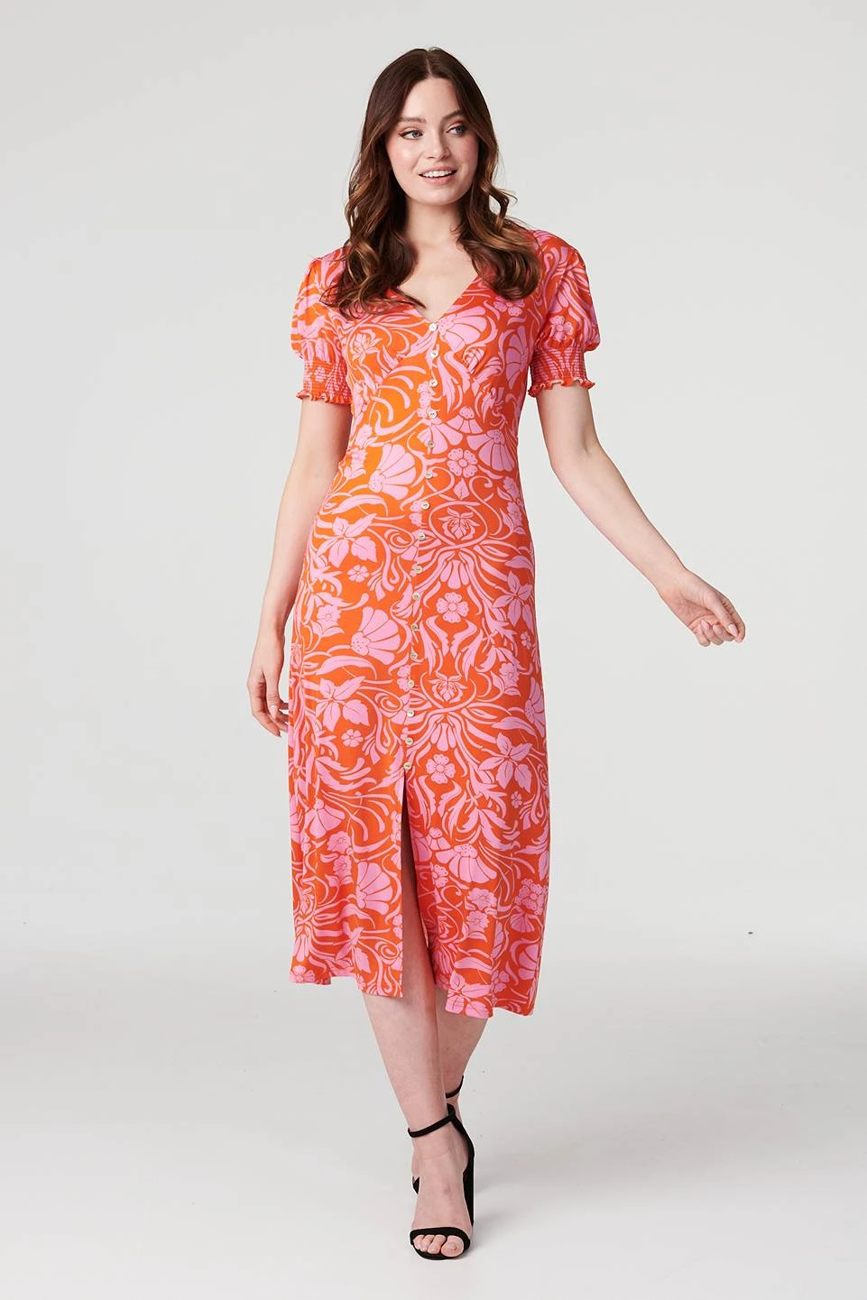 Add a standout print to your occasion wear collection with this floral slim fit midi dress. It has a v-neck, button front, short puff sleeves with shirred cuffs, a self-tie back detail and a midi length hem. Pair with neutral heels for a sophisticated daytime style.