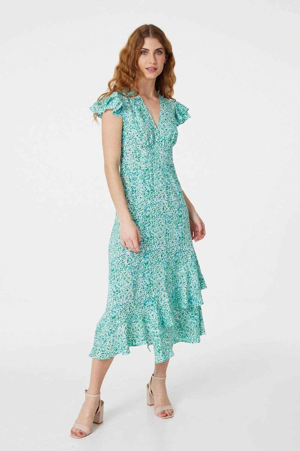 Add a flattering everyday ditsy floral print midi dress to your collection. With a v-neck, frilled cap sleeves, a frilled asymmetric hem and a below the knee skirt. Pair with heeled wedges for a daytime wedding outfit or dress down with flat sandals for the weekend.