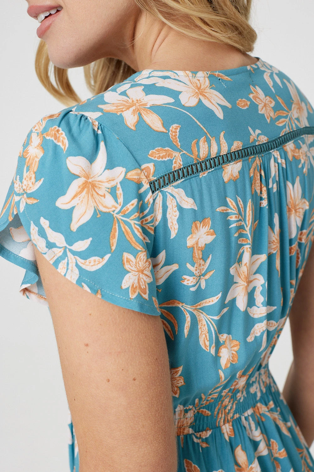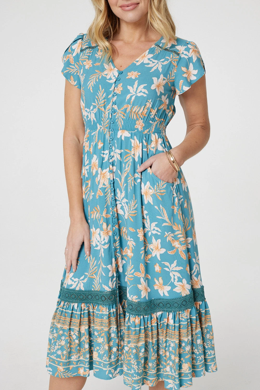 Turn some heads this summer in this lightweight midi dress. Complete with a v-neck, short tulip sleeves and a shirred waist, you’re sure to look stylish at your next day or evening out. It also has a tiered skirt, pockets and button details. Style with sandals for a warm evening out on holiday.