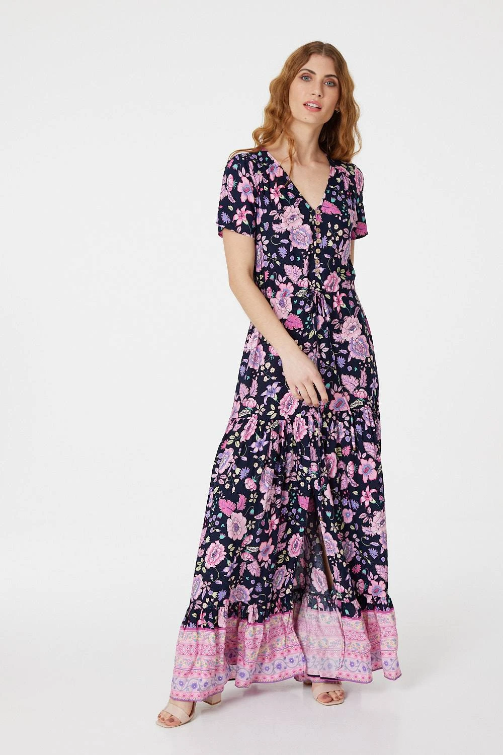 Make a statement in this bold floral maxi dress. With a v-neck, short sleeves, a button font, a tie detail waist and a tiered full maxi skirt, in comfortable breathable 100% viscose fabric. Dress up with low block heels for a chic daytime look or dress down on vacation with flat sandals.