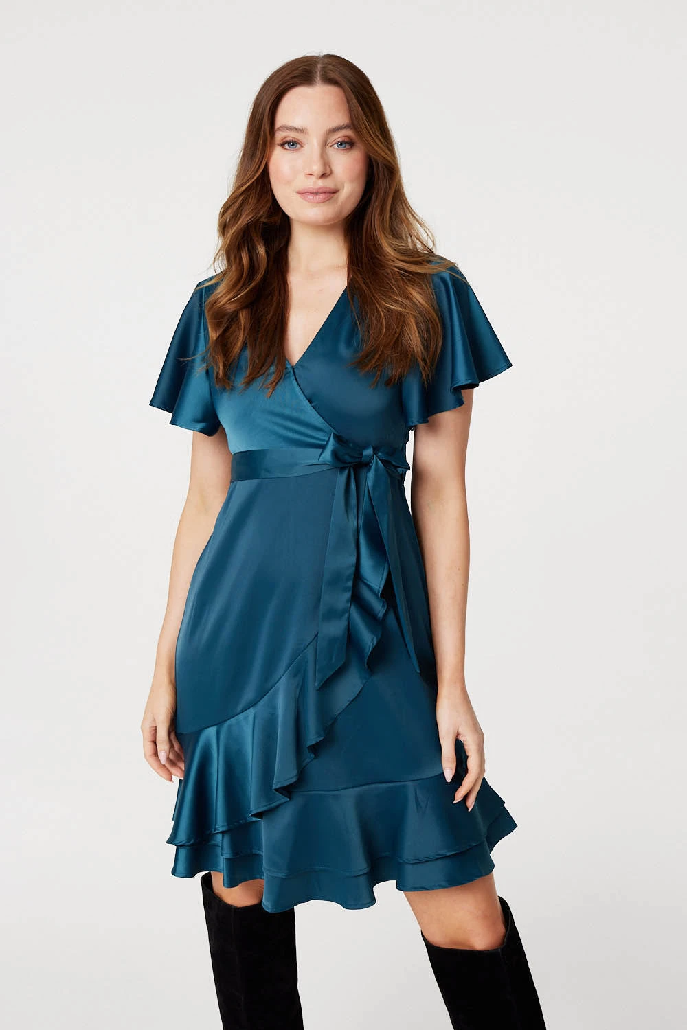 Update your little black dress style with this elegant short wrap dress. It has a V-neck, a wrap front with a frill detail, short angel sleeves, a detachable self-tie belt and a short layered hem. Pair with strappy heels for a look that’s both classic and effortlessly chic.