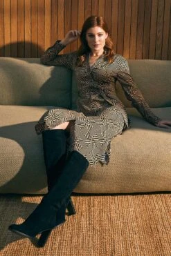 Every closet needs a bold printed shirt dress like this geo printed style. With a v-neck, a classic collar, a button front, long sleeves, a self-tie belt and a straight midi skirt with side split details. Style with knee high boots for an effortless day to night outfit.