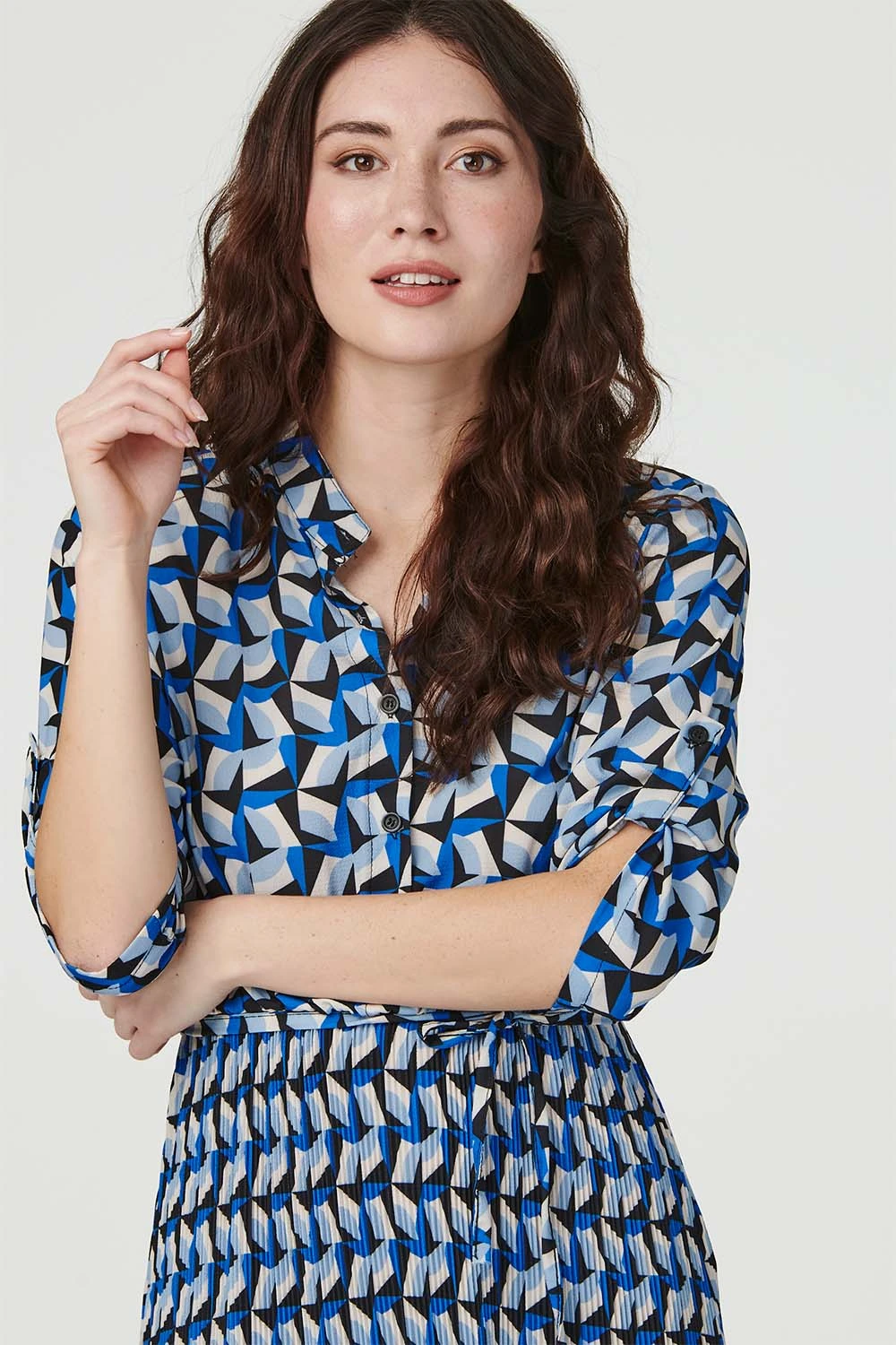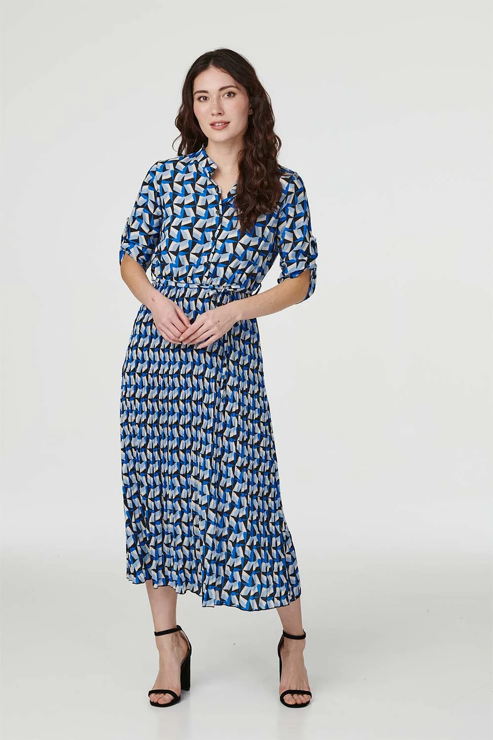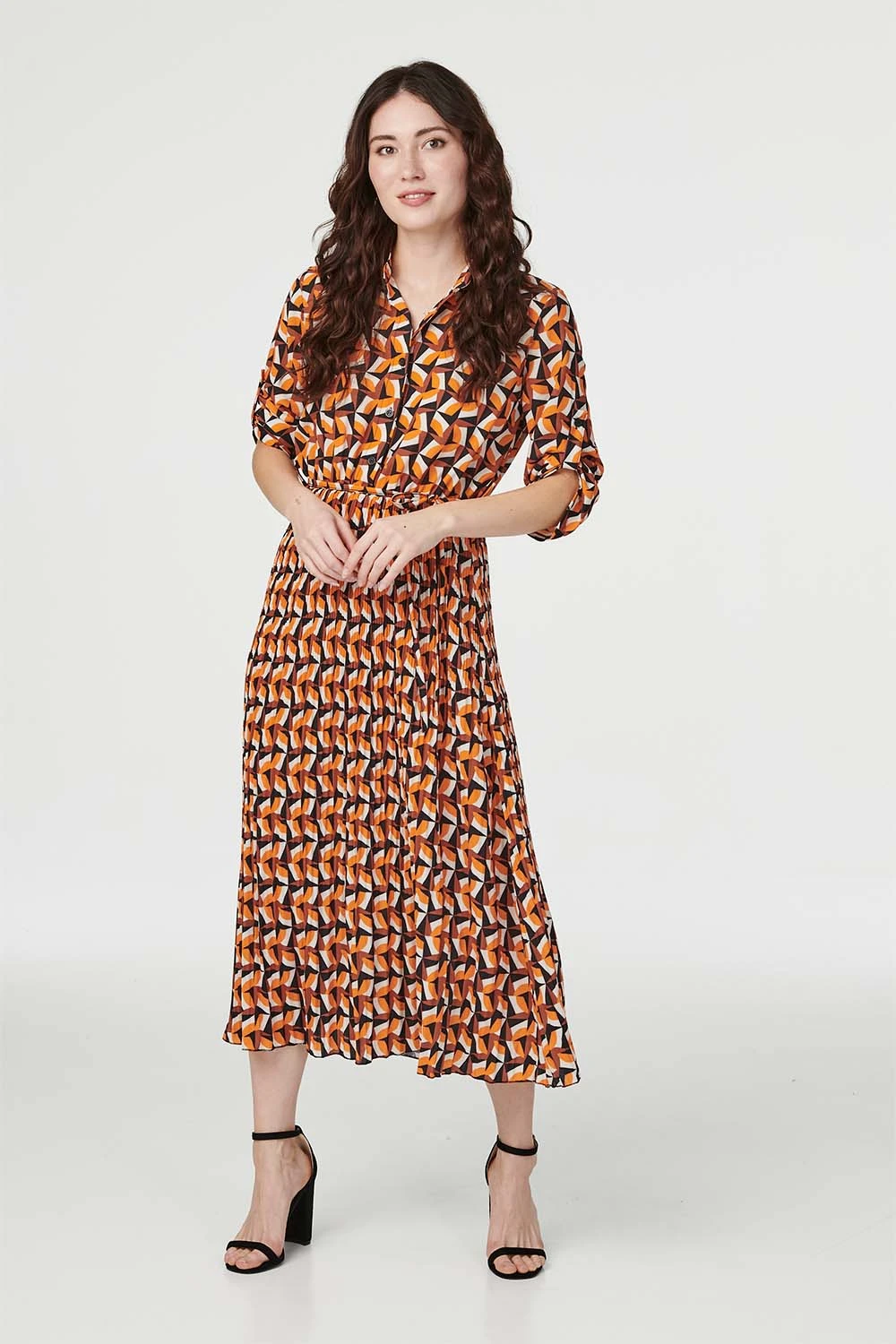 Opt for a bold retro printed shirt dress this season. With a v-neck, classic collar, button front, 3/4 roll sleeves, a tie detail waist and a full pleated midi skirt. Style with black heels for a chic outfit for every event from day to night.