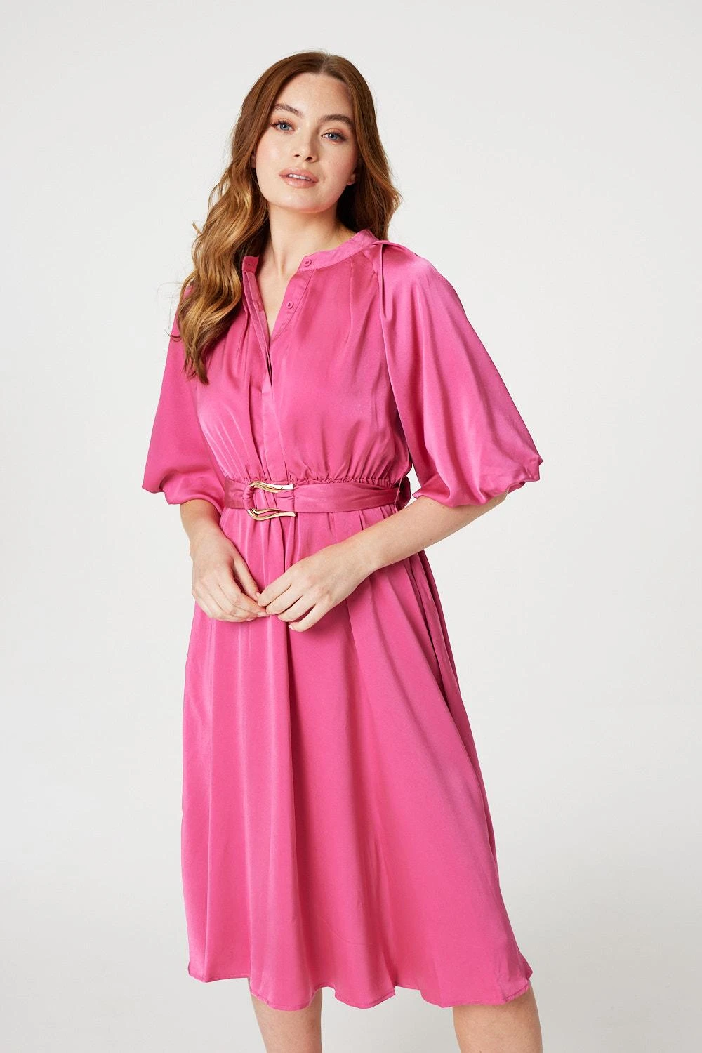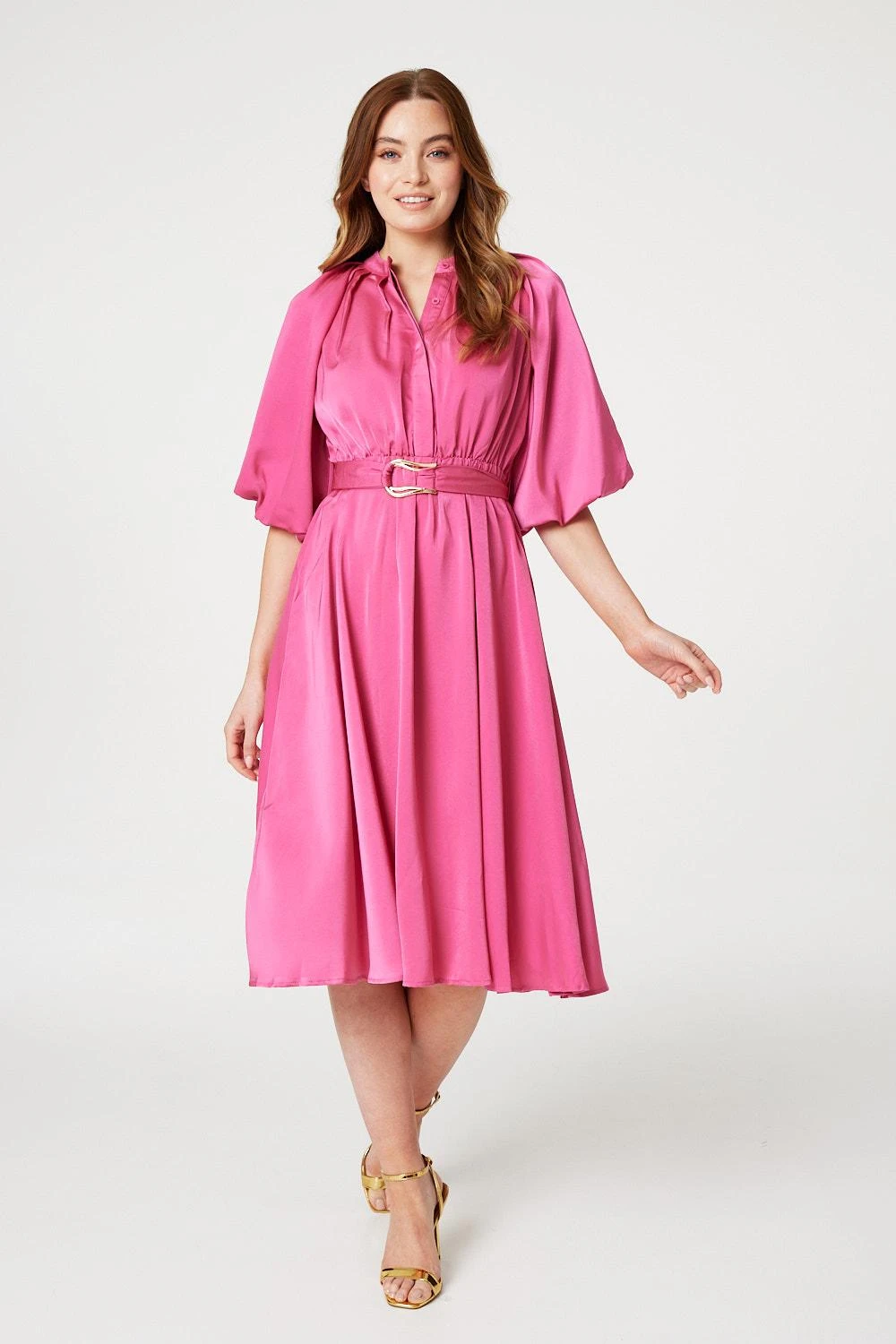 Add an elegant style to your dress collection with this fit & flare midi. It has a high neck, a ruched shoulder detail, a concealed button front detail, an elasticated waist, detachable belt, 1/2 length puff sleeves and a flared midi length skirt. Pair with metallic heels for a standout look that’s sure to turn heads at any occasion.