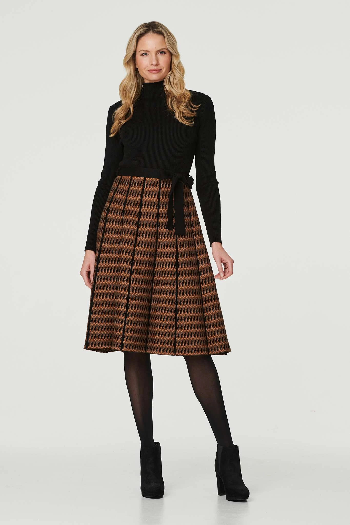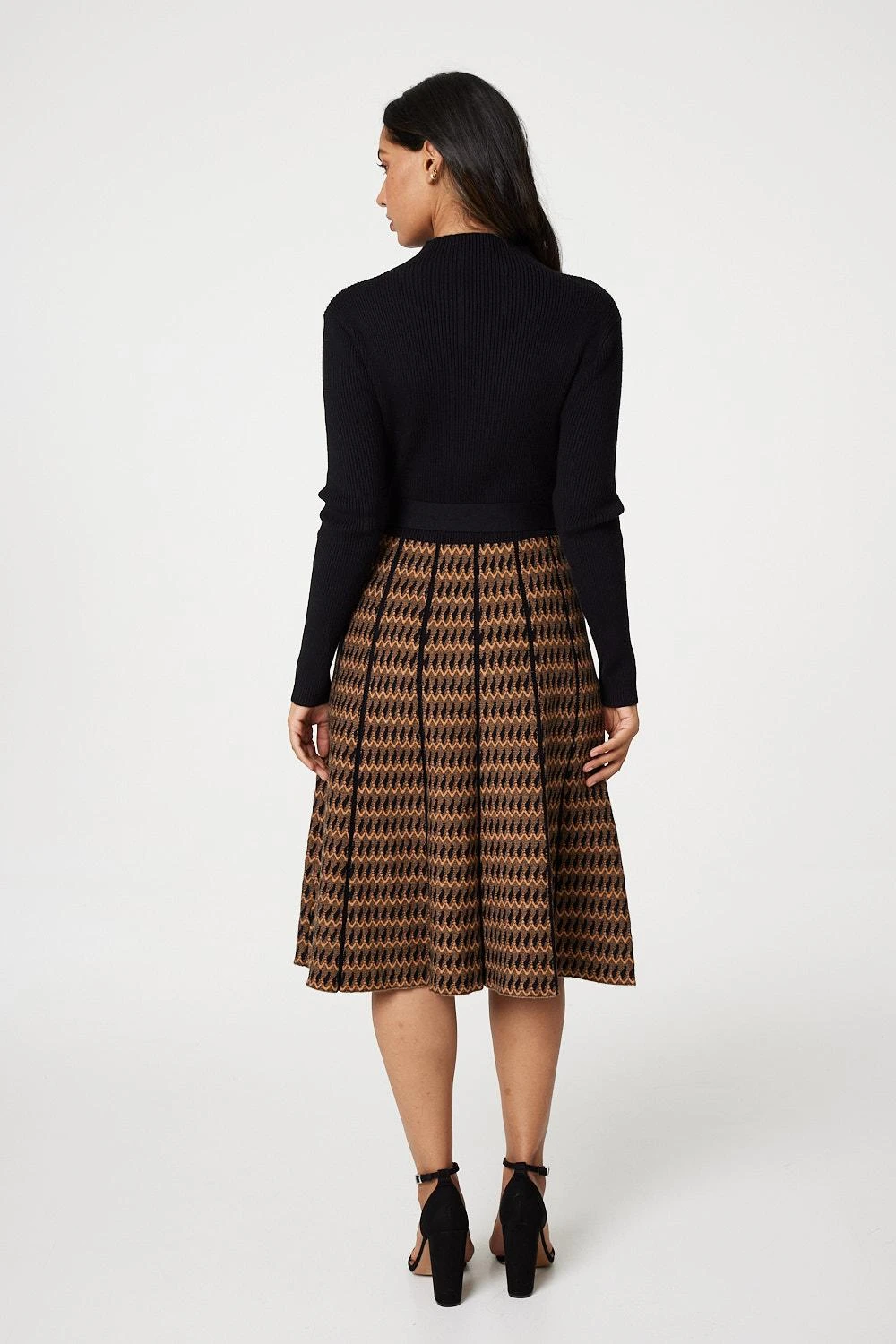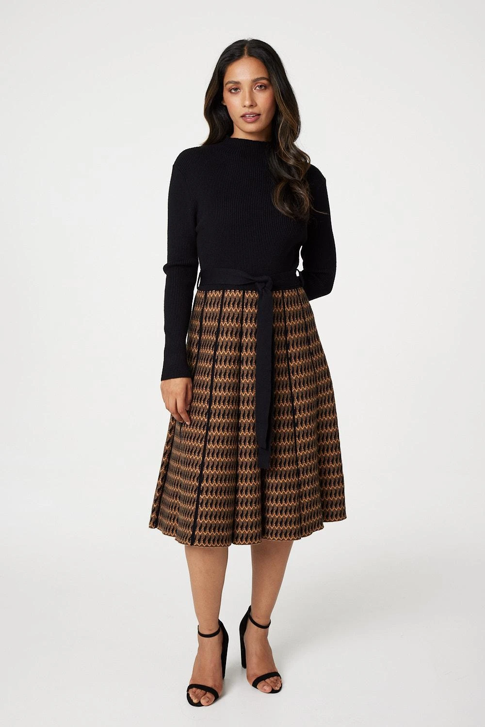 Add an elegant knit dress to your collection with this midi skater dress. It has a high neck, long sleeves, a self-tie belt and a pleated midi length skirt. Pair with neutral heels for a go-to style that’s great to wear as it turns cold outside.