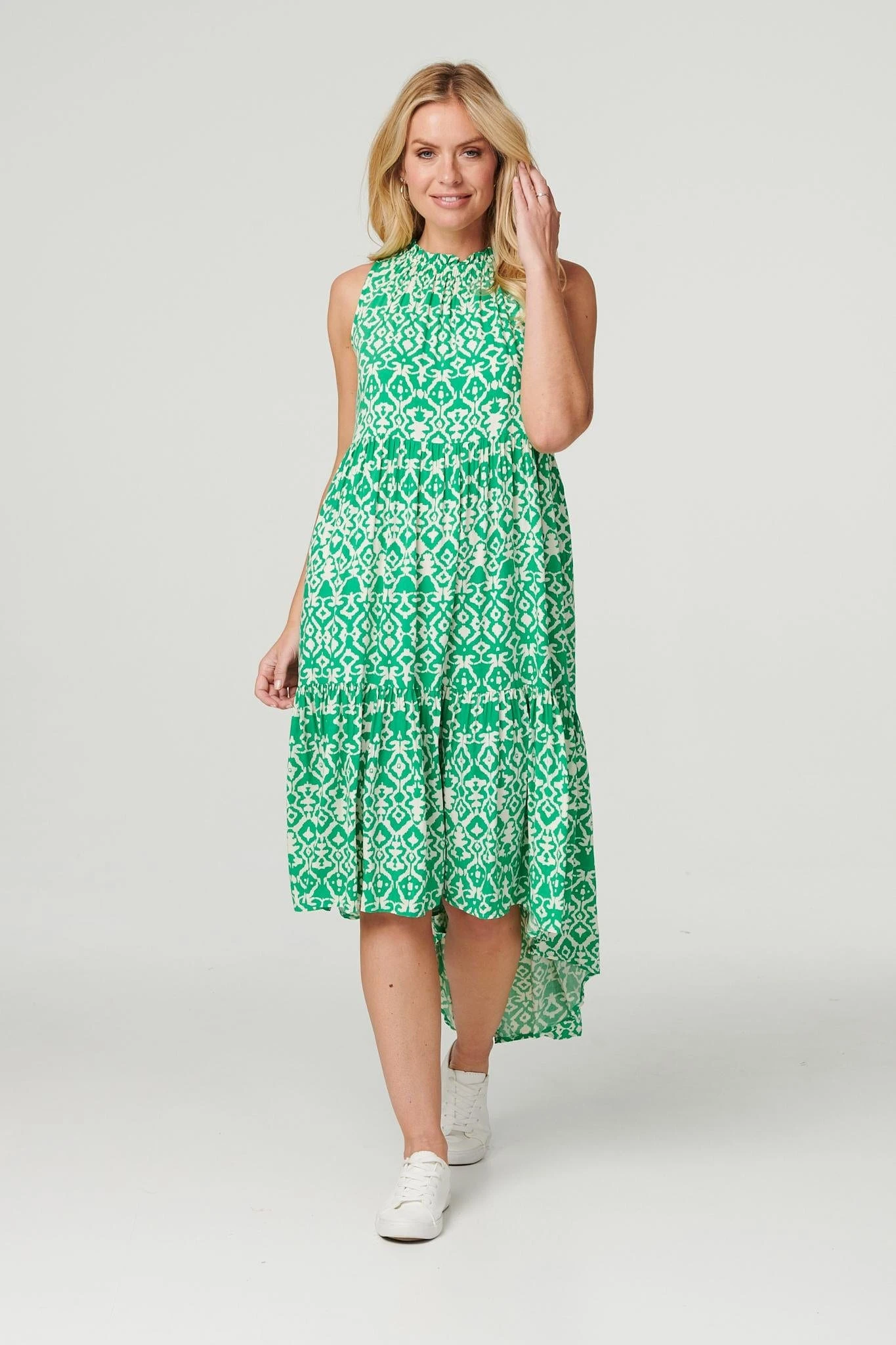 Add a bold ikat print to your dress collection with this versatile midi dress. It has a frilled high neck, a sleeveless fit and a tiered high-low midi length hem. Made from 100% breathable viscose it’s the perfect addition to a holiday wardrobe. Pair with heeled sandals for a chic warm weather style.