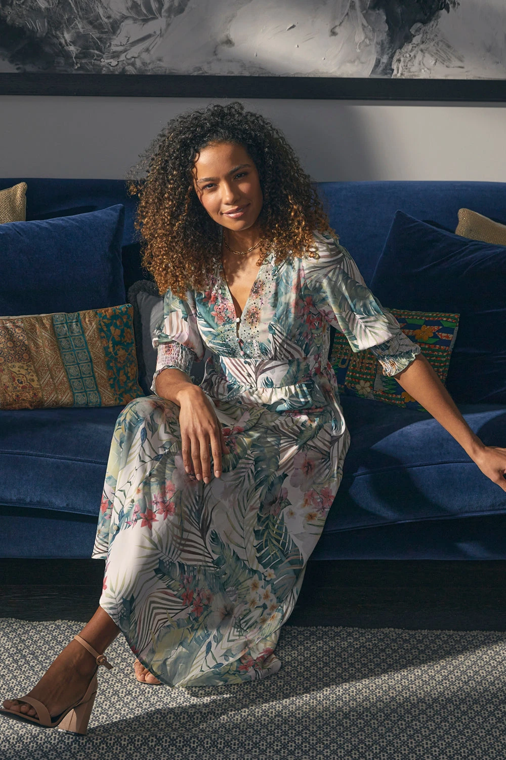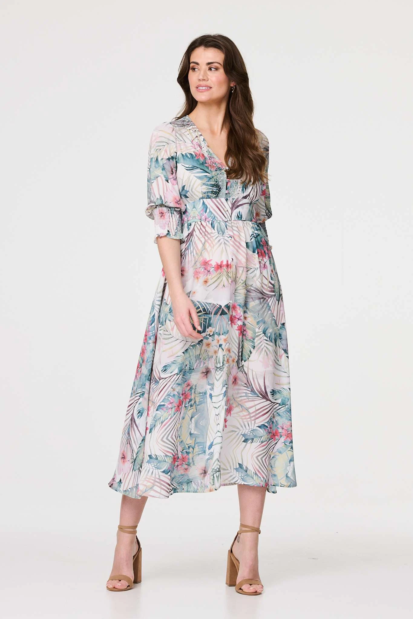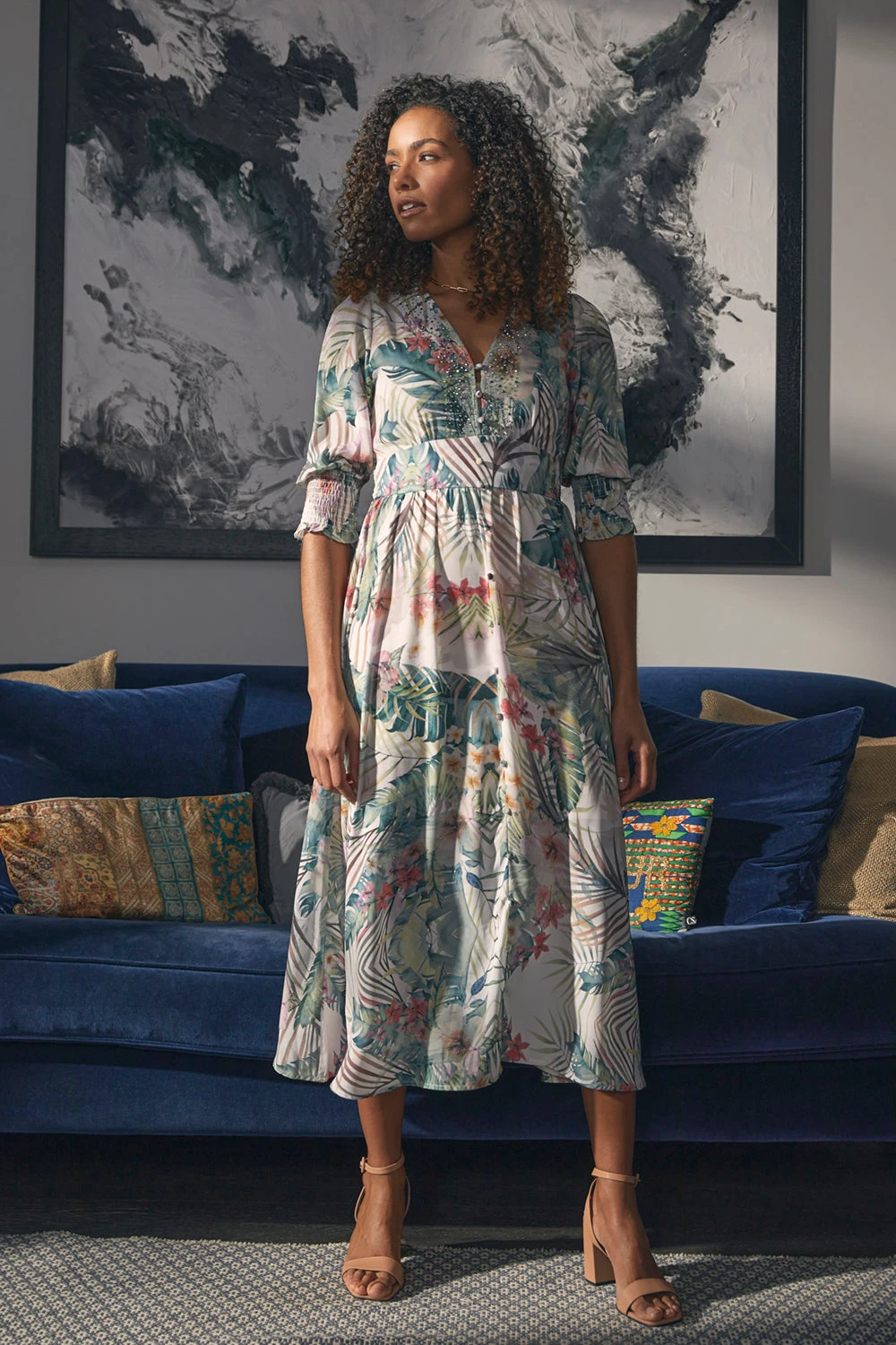Get an effortlessly stylish look in this midi dress. Complete with 3/4 puff sleeves and diamante embellishments, this dress is perfect for a casual evening look, or a even formal event dress code with heels. It has buttons, a v-neck and a midi length hem.