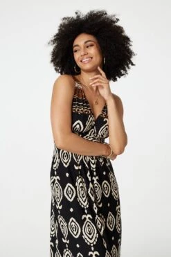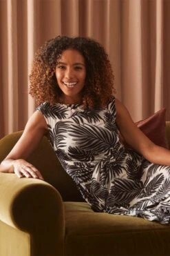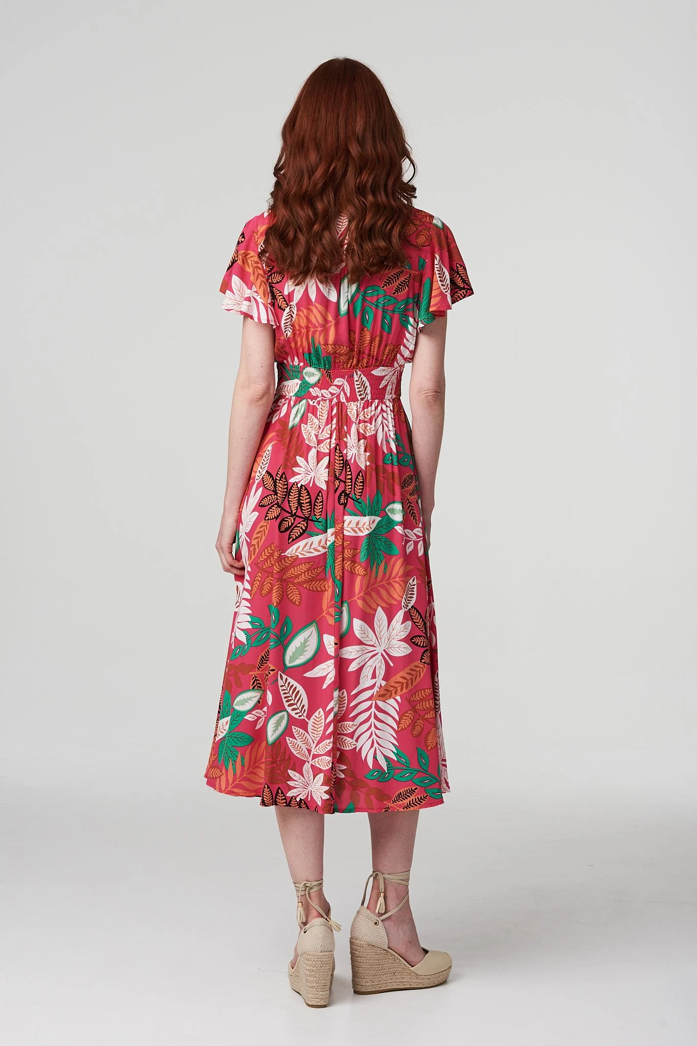 Add a vibrant print to your dress collection with this leaf printed midi. Made from 100% viscose, it has a v-neck, with a button front detail, short angel sleeves, a shirred waist, side pockets and a midi skirt. Team with espadrille wedges or flat sandals for a standout holiday style.