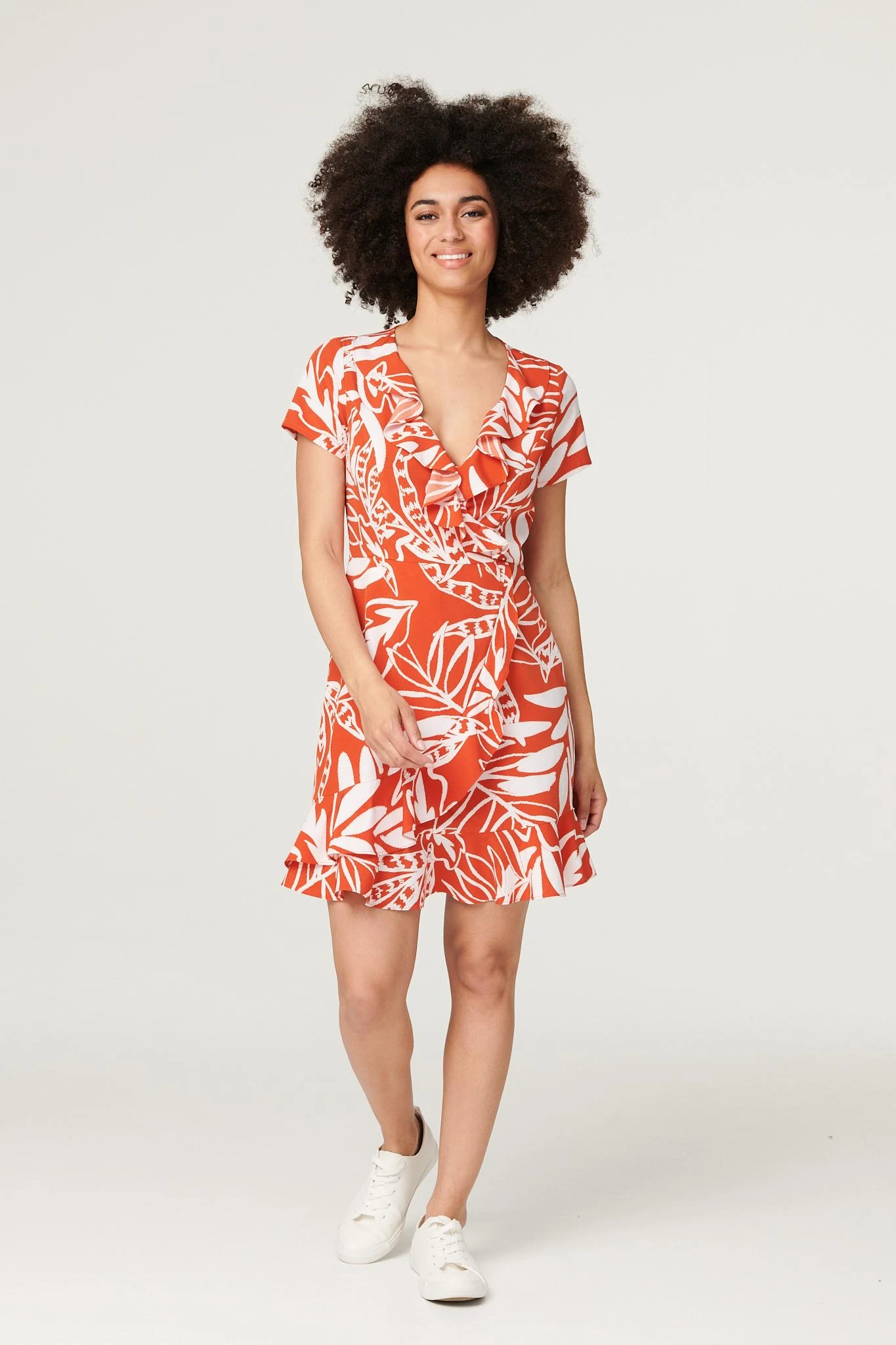Add a statement mini dress to your weekend wardrobe with this leaf print wrap dress. It has a V-neck, short sleeves, a wrap front with a ruffle detail and a mini length skirt. Pair with fresh white trainers for an elevated off-duty style.