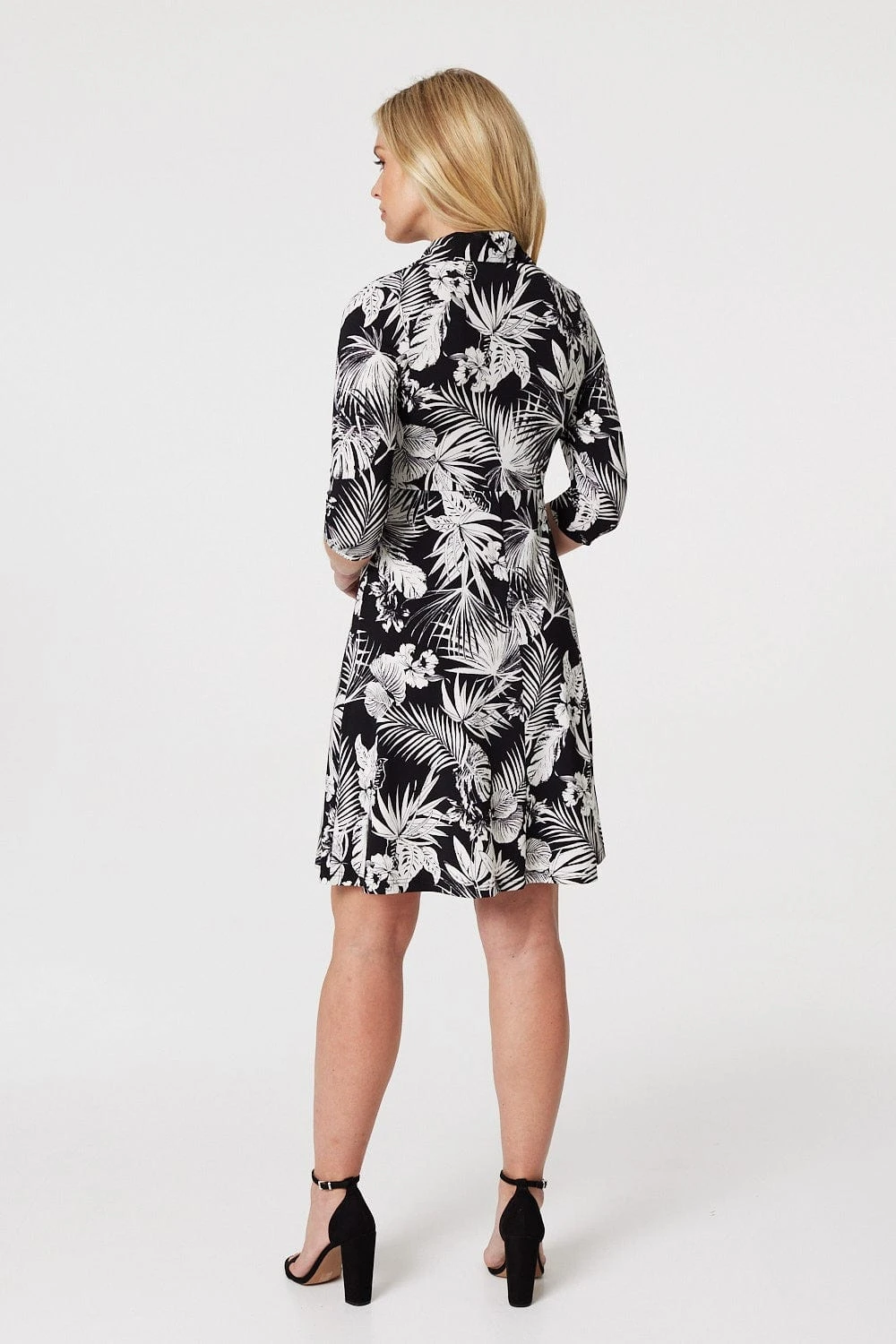 Add a statement leaf print to your wardrobe with this elegant shirt dress. It has a V-neck, collar, wrap front, 3/4 sleeves and a short skater skirt. Made from a soft non-iron jersey fabric, it’s a great grab and go dress to have you looking stylish in seconds! Pair with neutral block heels for a standout warm weather look.