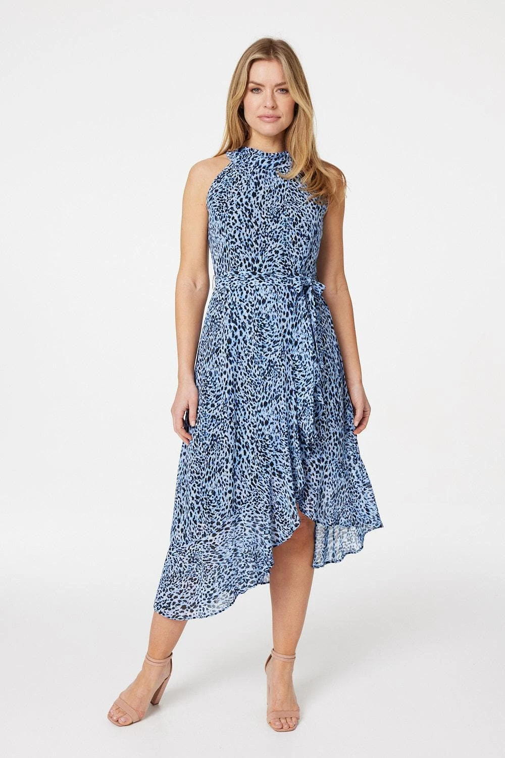 Add a sophisticated occasion dress to your wardrobe with this leopard print midi. It has a high neck, a sleeveless fit, a self tie waist, a keyhole back and a high low midi skirt with a pephem. Pair with neutral strappy heels and a cropped denim jacket for a look that’s perfect for date night.