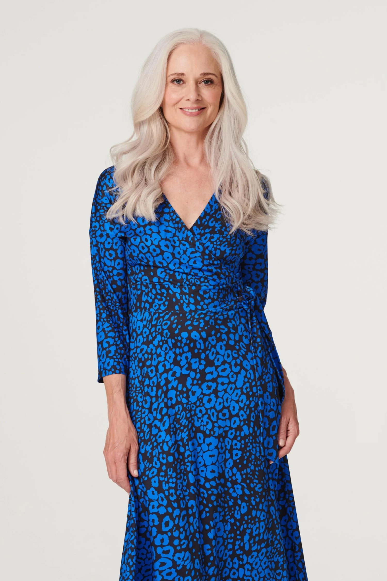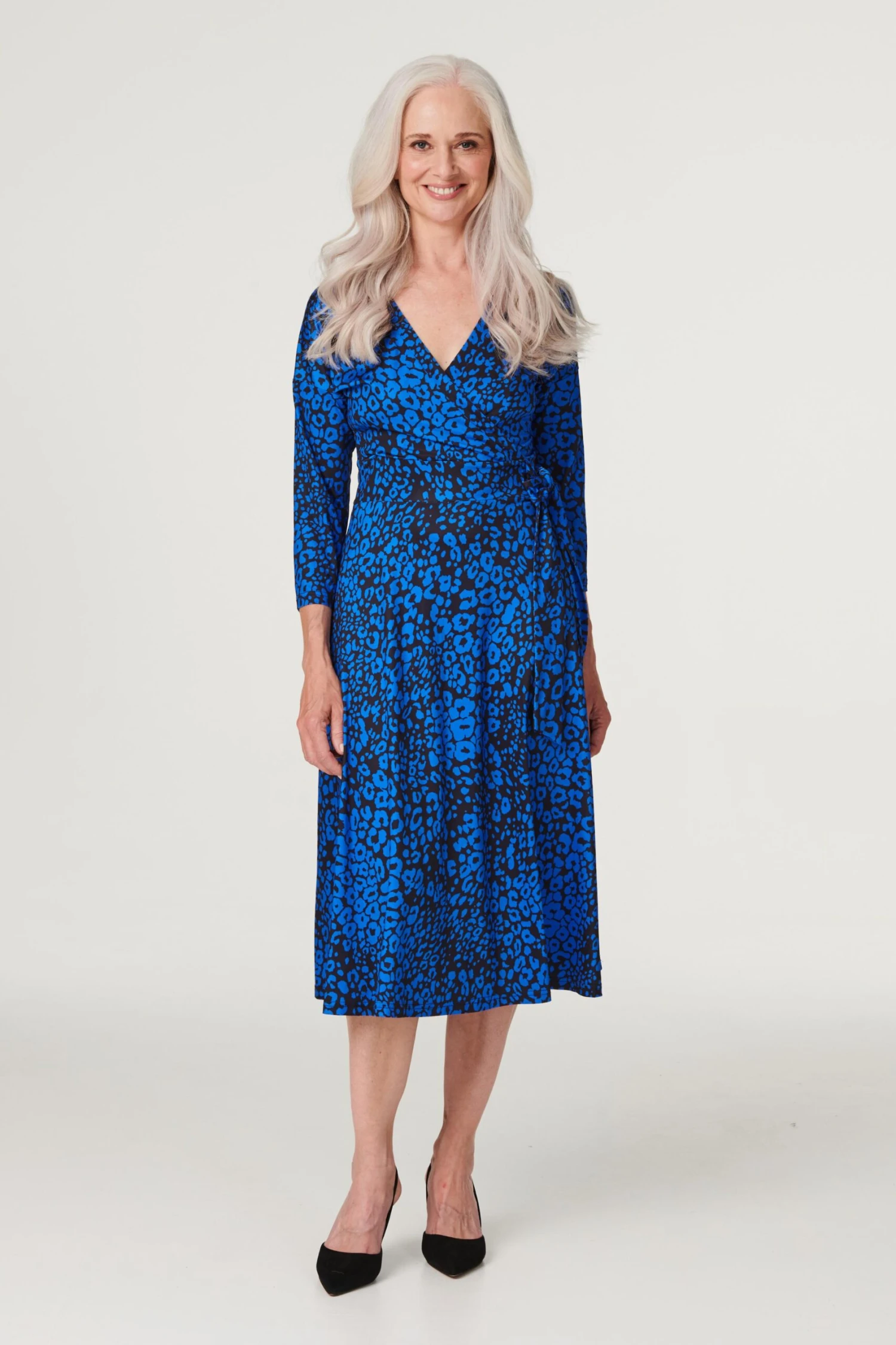 Make a statement in this vibrant leopard print wrap dress. It has a v-neck, wrap front, a self-tie waist detail, 3/4 sleeves and an a-line midi length skirt. Made in a non-iron stretch jersey fabric, it’s a great grab and go outfit. Pair with elegant closed-toe heels for a sophisticated occasion wear style.