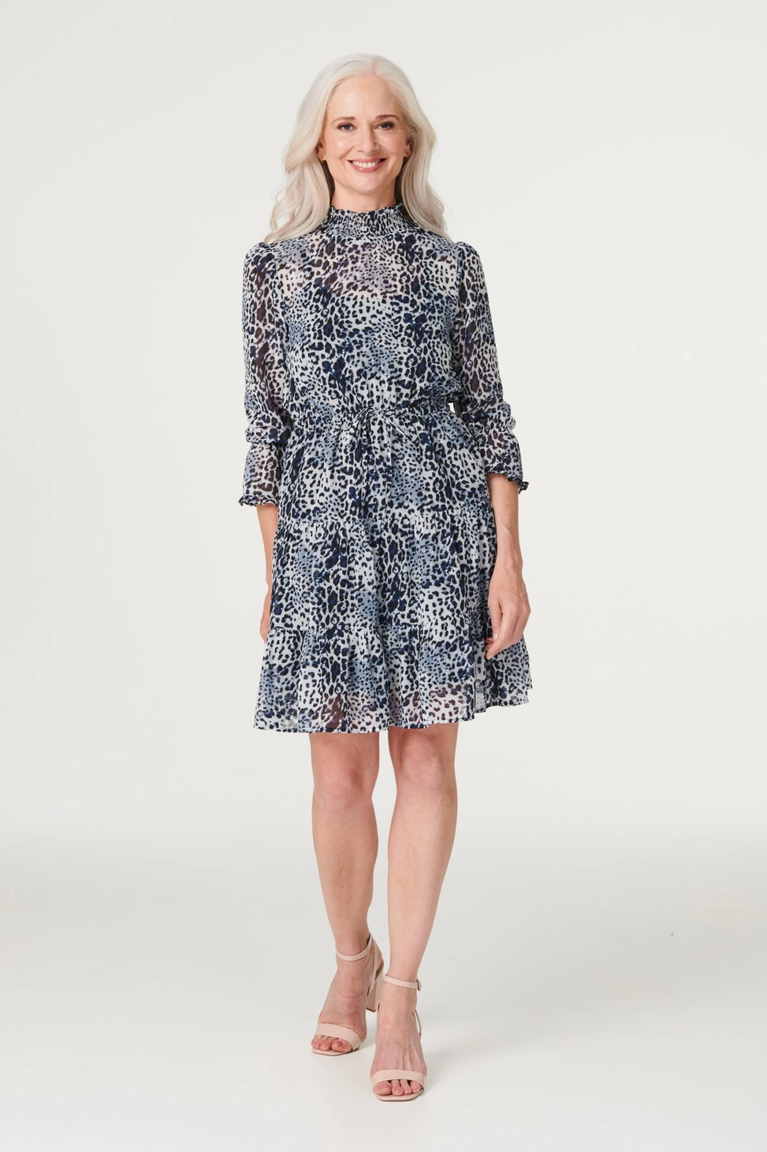 Add a statement occasion dress to your closet with this leopard print skater dress. It has a high shirred neck, 3/4 semi-sheer sleeves with shirred cuffs, a cinched waist, fit & flare silhouette and a layered short skirt. Pair with blush heels for an elegant, yet head-turning style.