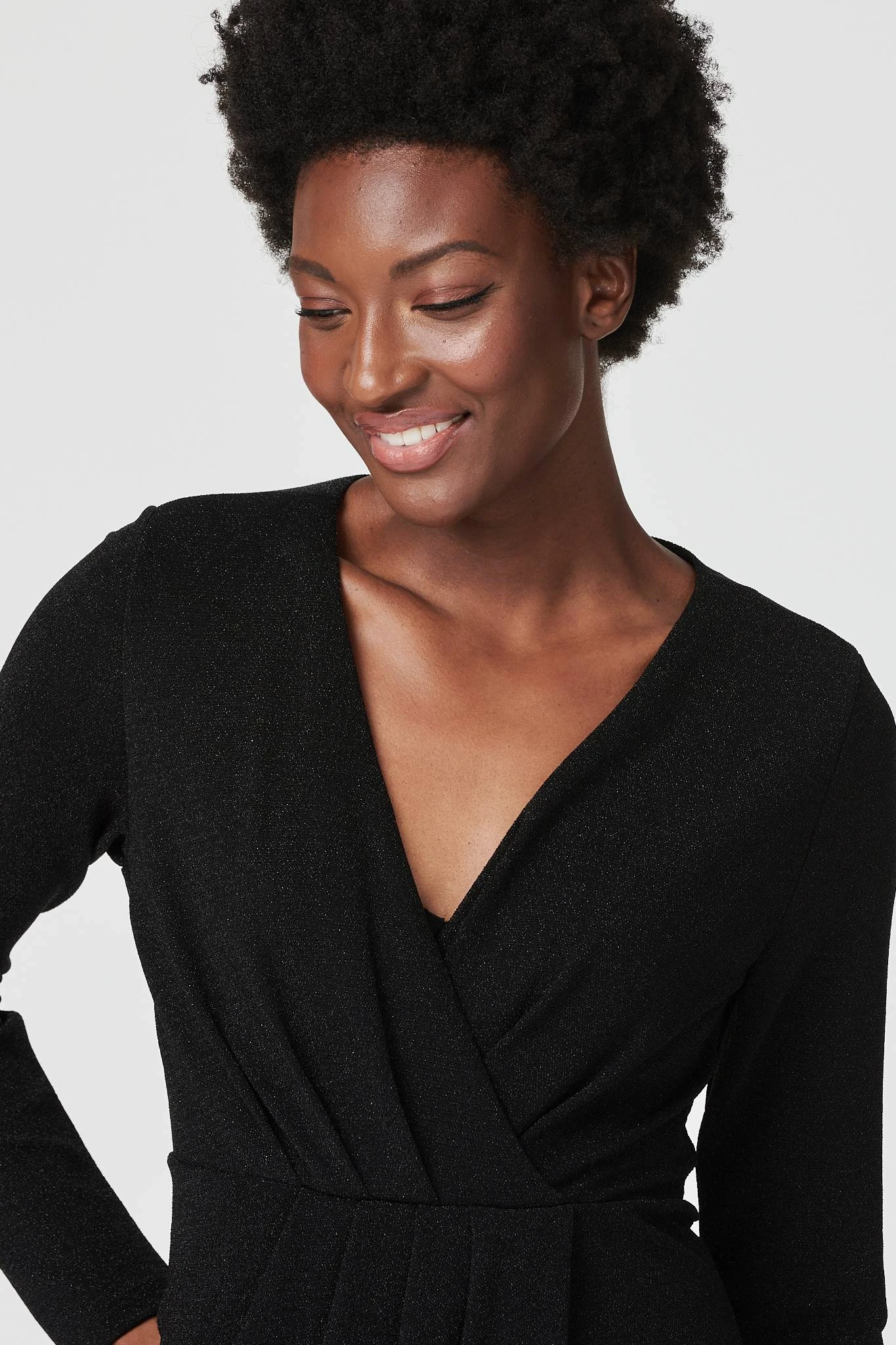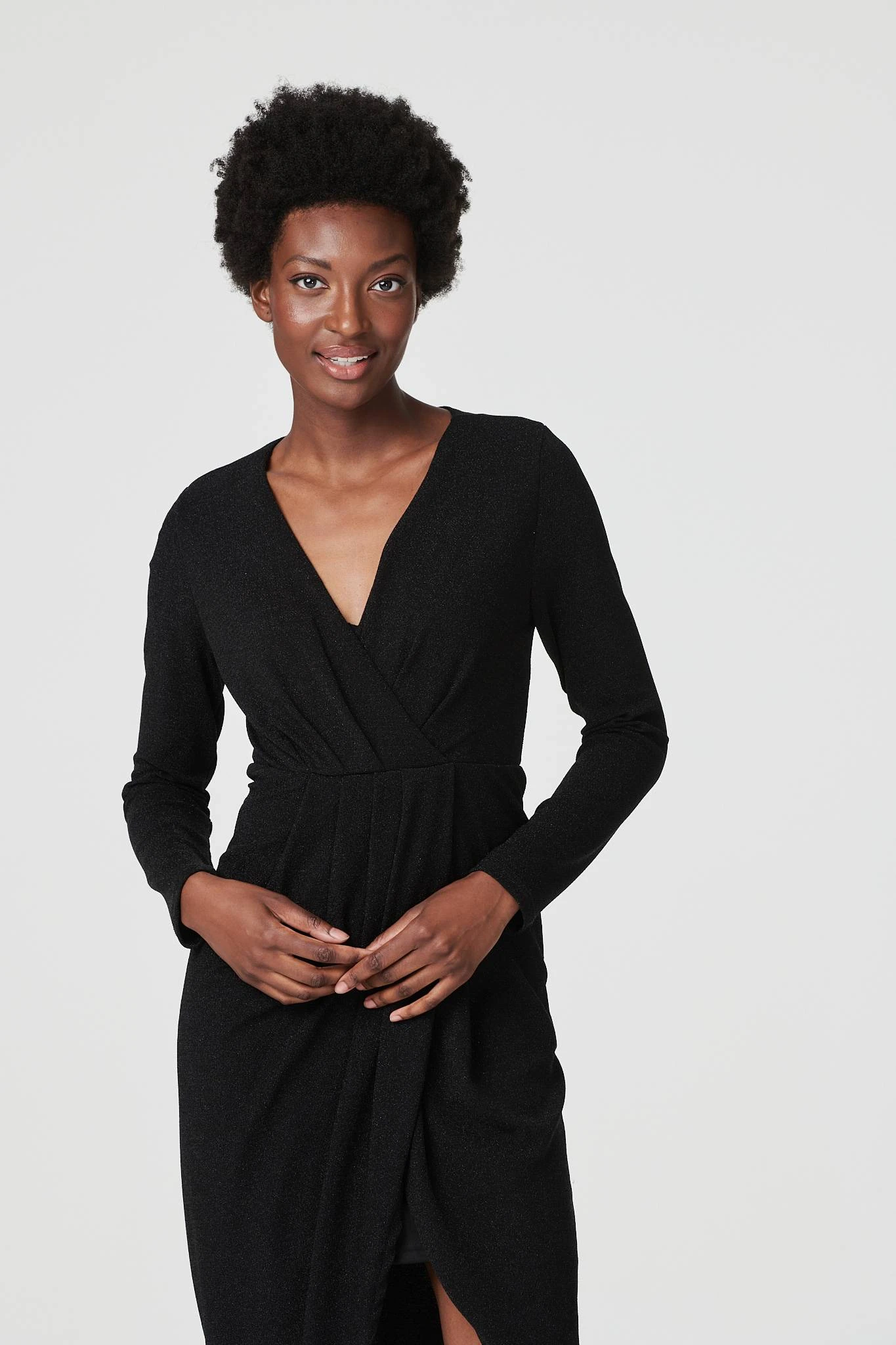 No evening collection is complete without a figure flattering lurex sparkly bodycon dress. With a deep v-neck, long sleeves, a ruched front detail, a faux wrap effect and an elegant pencil skirt sitting below the knee. Style with strappy heels and a matching clutch for a formal evening event.