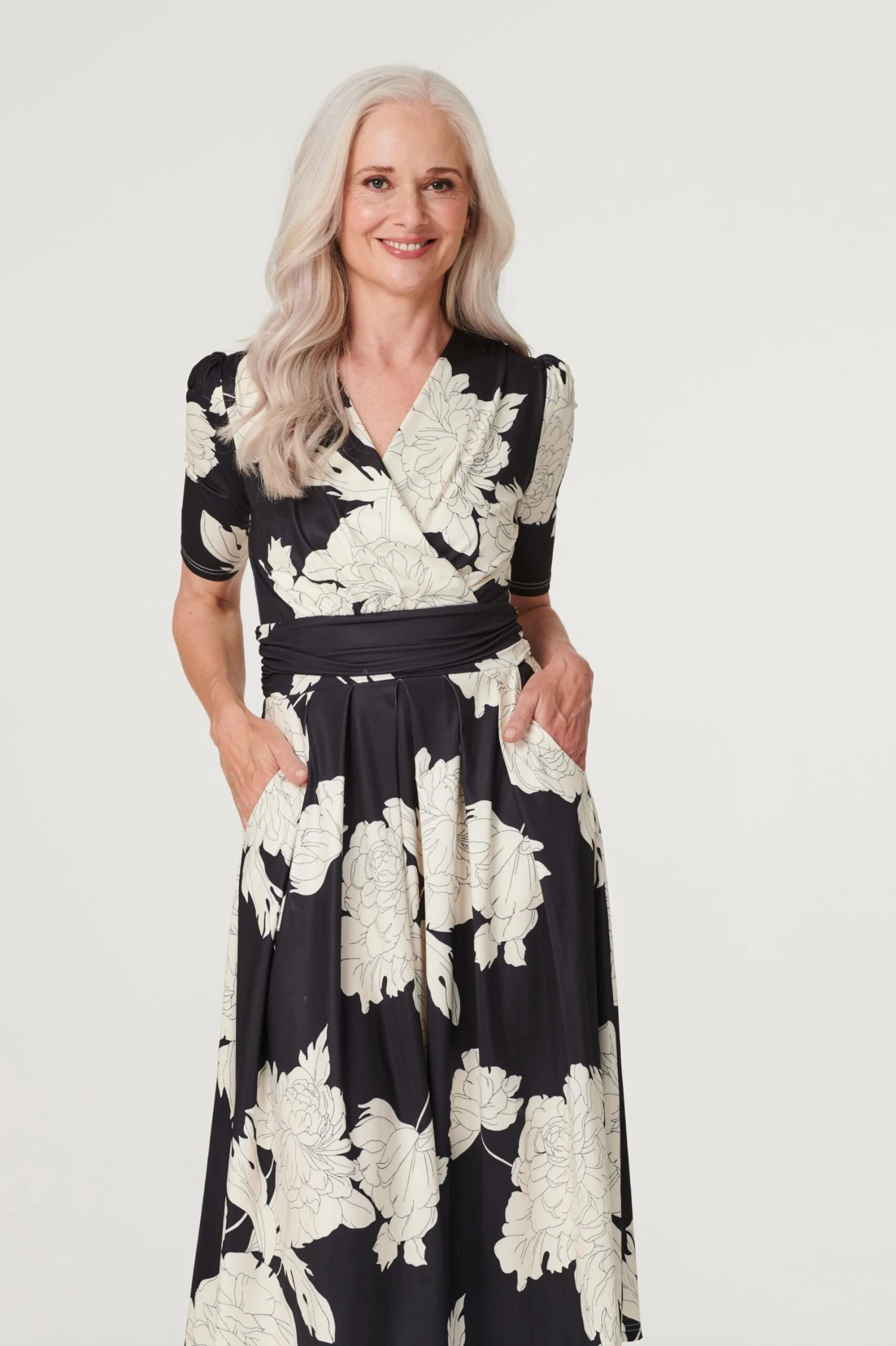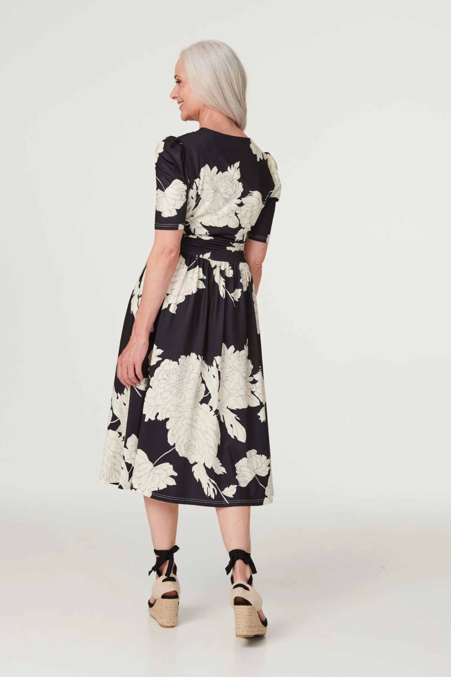 Add an on-trend monochrome print to your closet with this standout floral midi dress. It has a v-neck with a faux wrap front, a ruched waist, short sleeves and a ruched midi length skirt with a straight silhouette. Made from a non-iron stretch jersey fabric, it’s a perfect grab and go style you can wear for any occasion from brunch with friends to a daytime wedding.