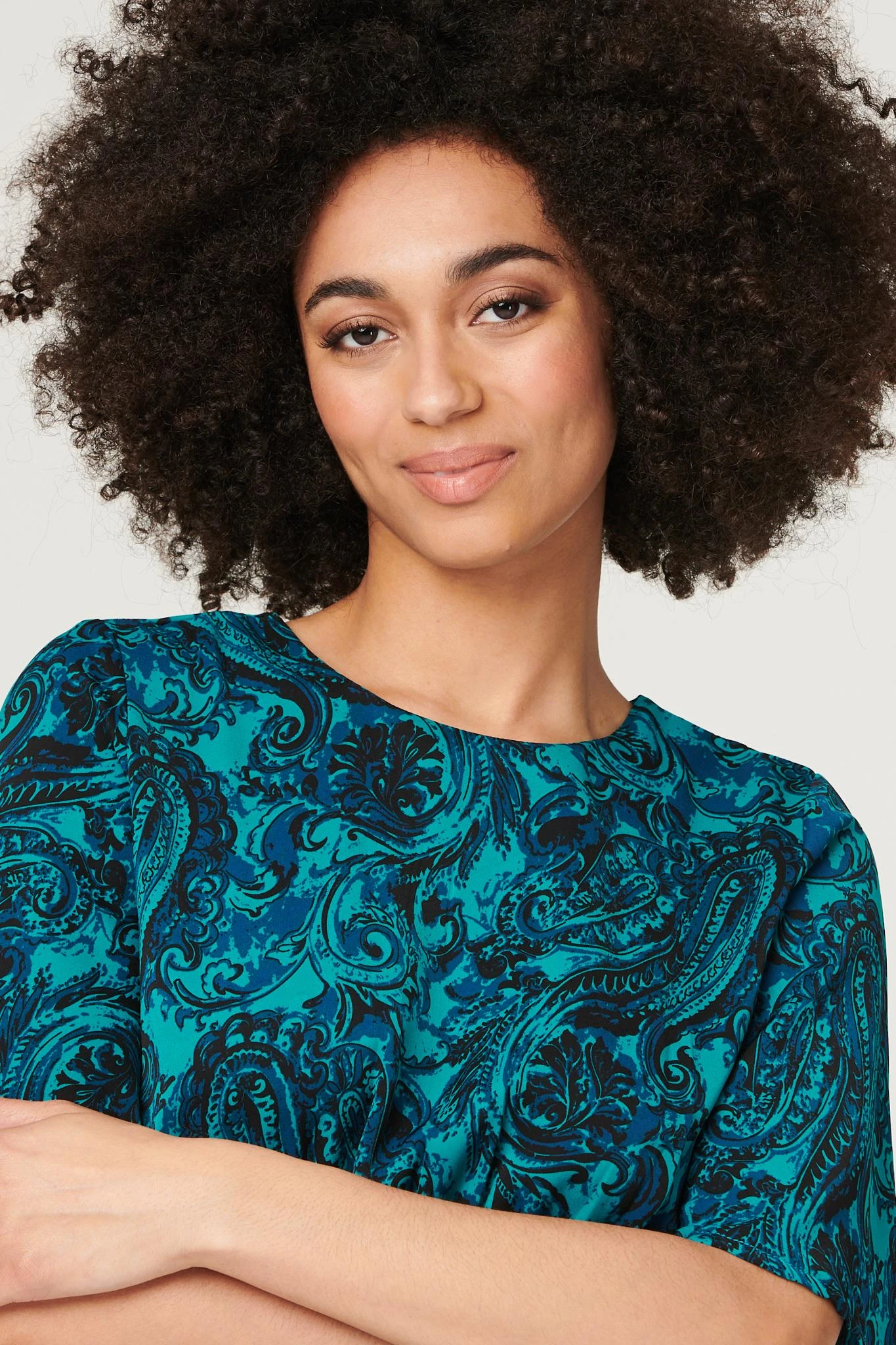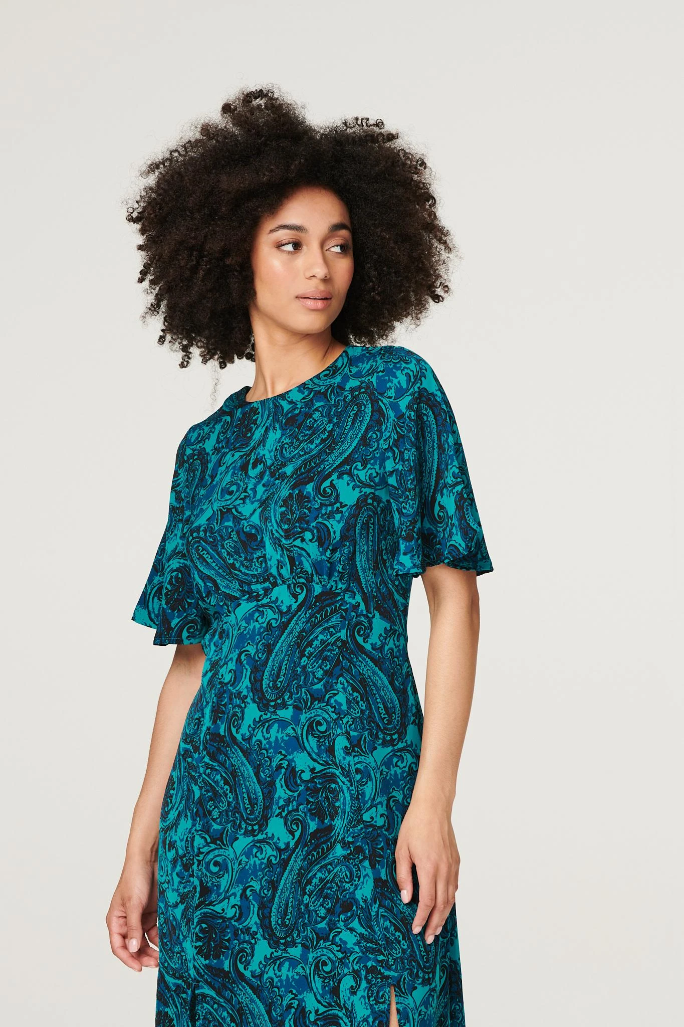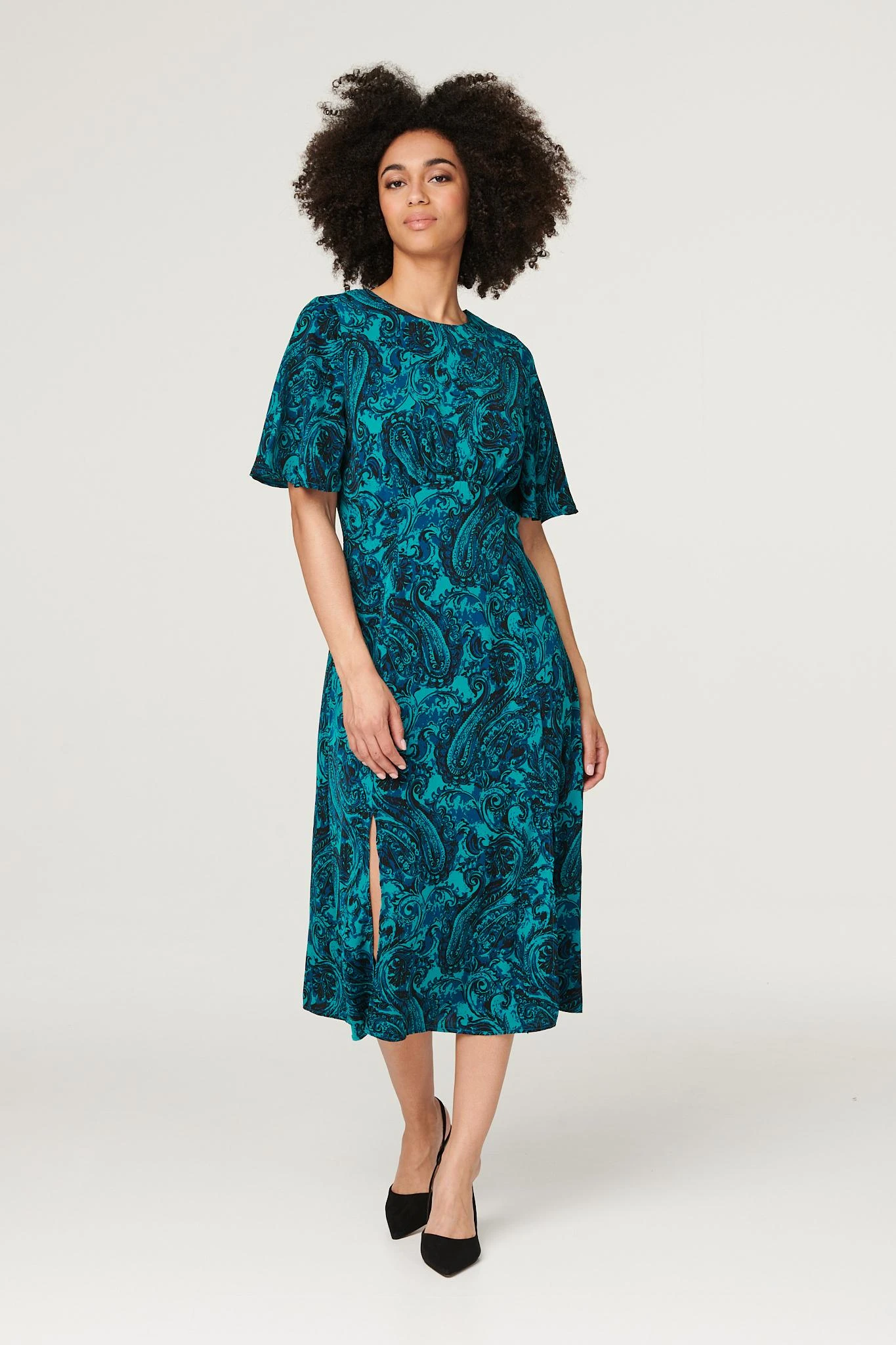 Add a vibrant paisley print to your closet with this flattering midi dress. It has a round neck, 1/2 length angel sleeves, a cinched waist and an A-line midi length skirt with a front split. Pair with closed toe heels for an elegant style you can wear for any occasion from a friend’s wedding to an a work event.
