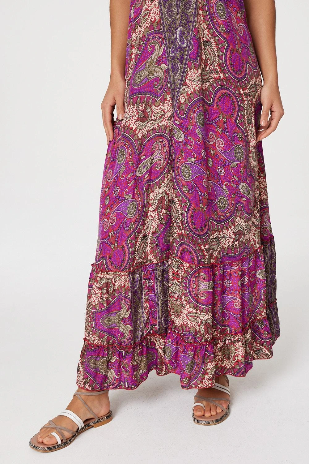 Add a statement print to your holiday closet with this maxi sun dress. It has a self-tie halter neck, sleeveless fit and a tiered maxi length skirt. Pair with flat sandals for an elegant poolside style, or elevate with heeled espadrilles for an evening out.