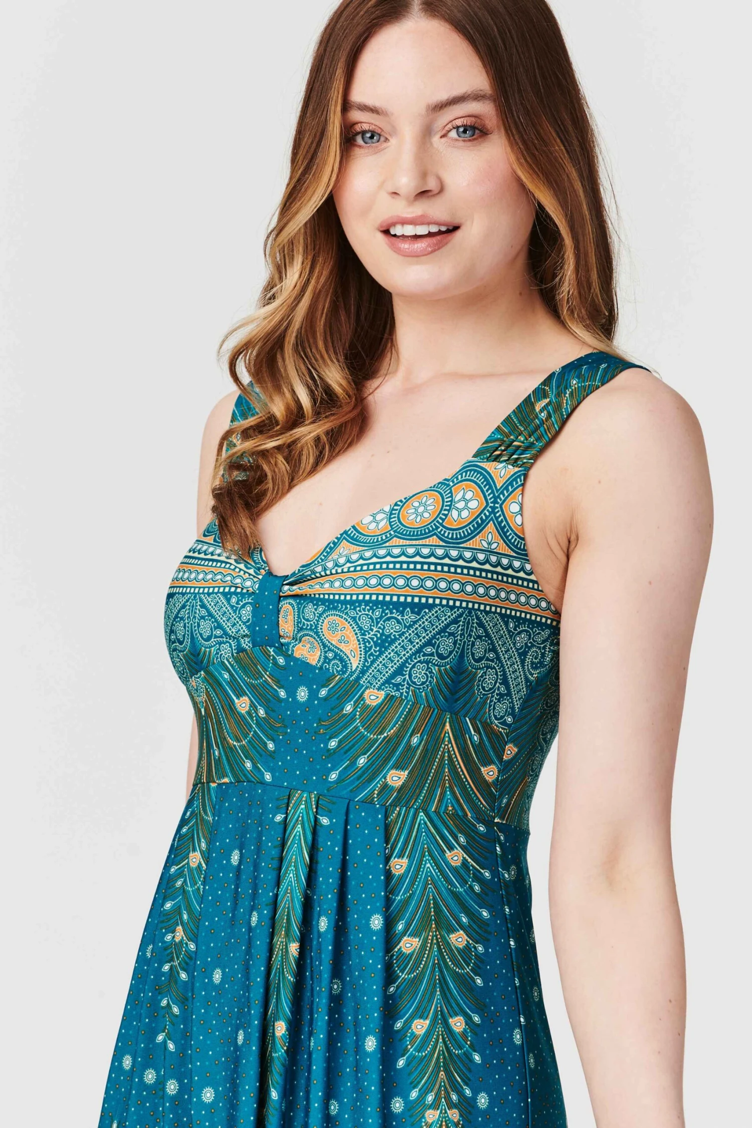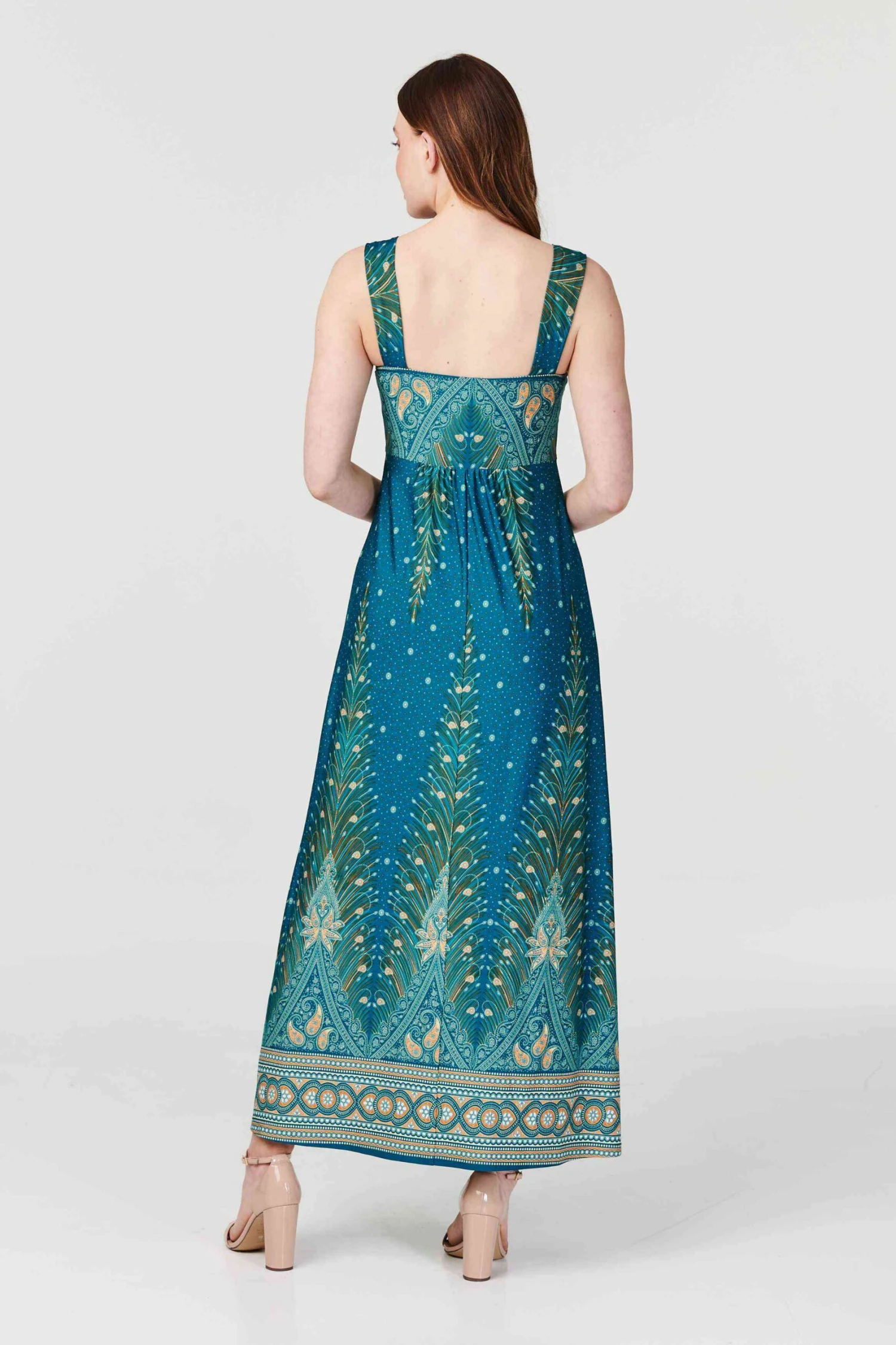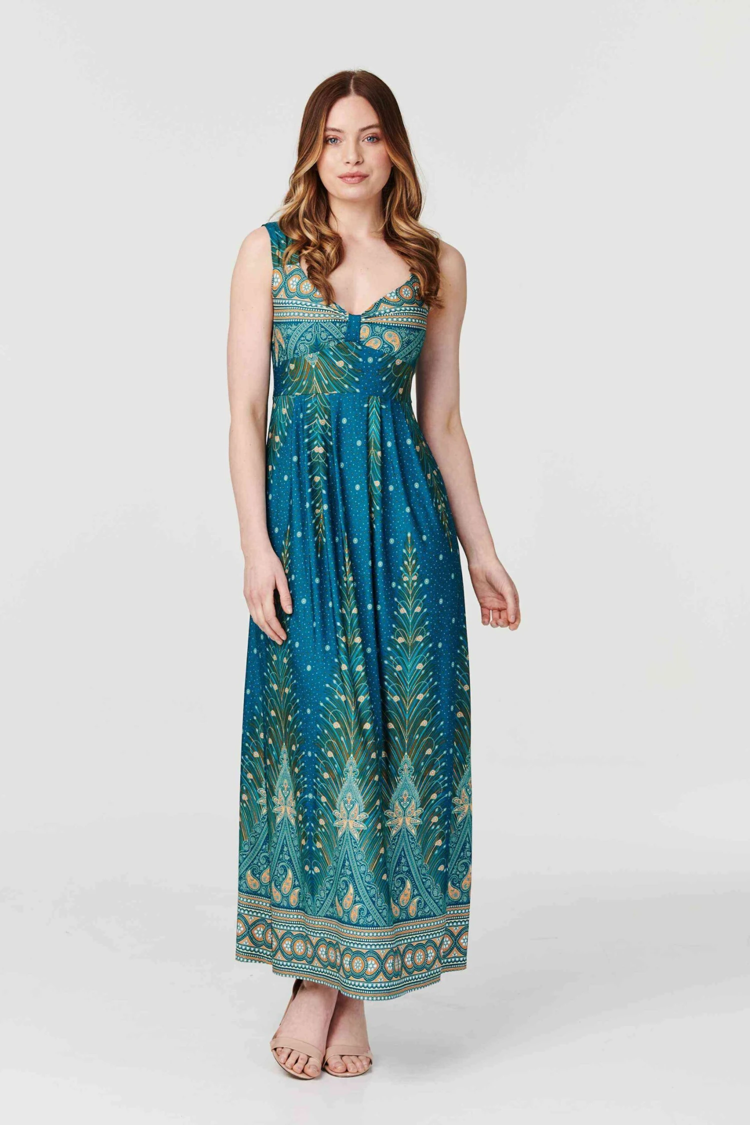 The perfect warm weather update is this paisley printed a-line maxi dress. With a v-neck, wide cami straps, an empire waist and a straight full length skirt. Pair with blush heels for a chic dinner outfit on vacation or dress down with flat sandals.