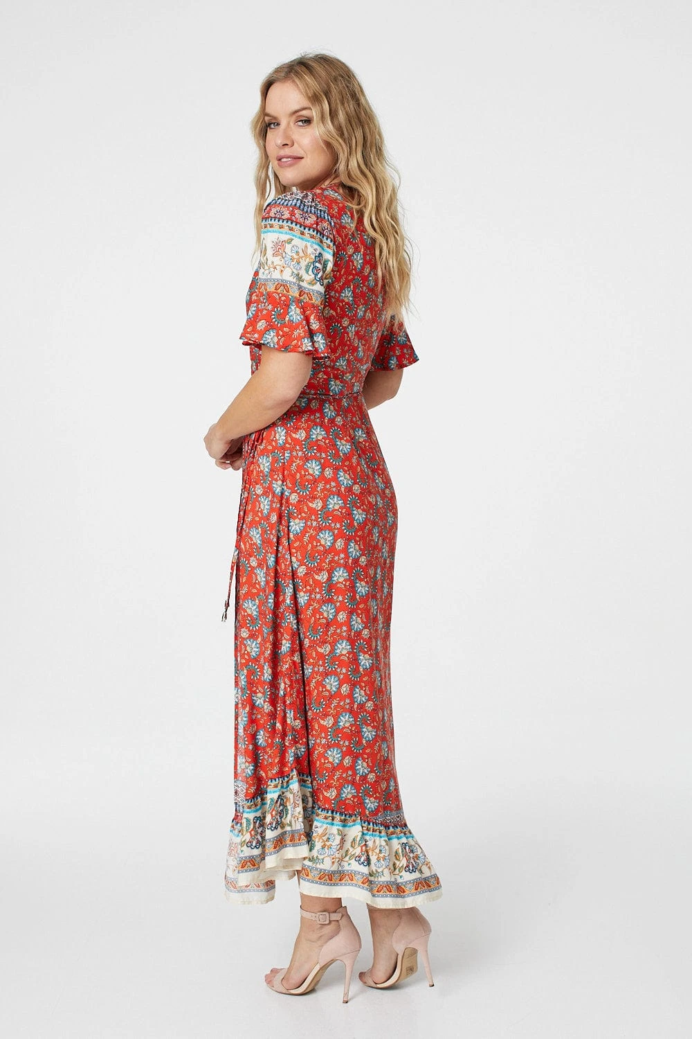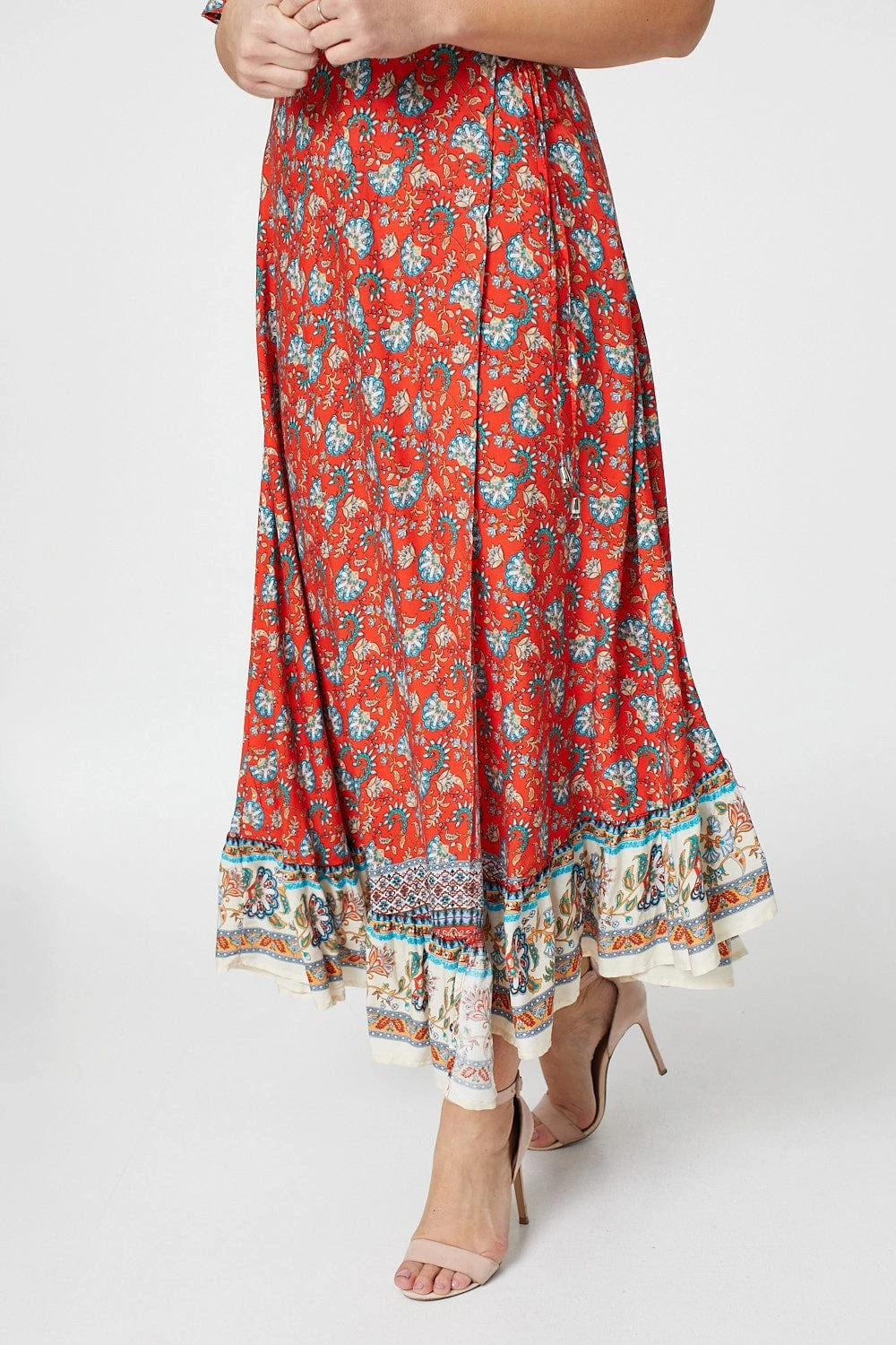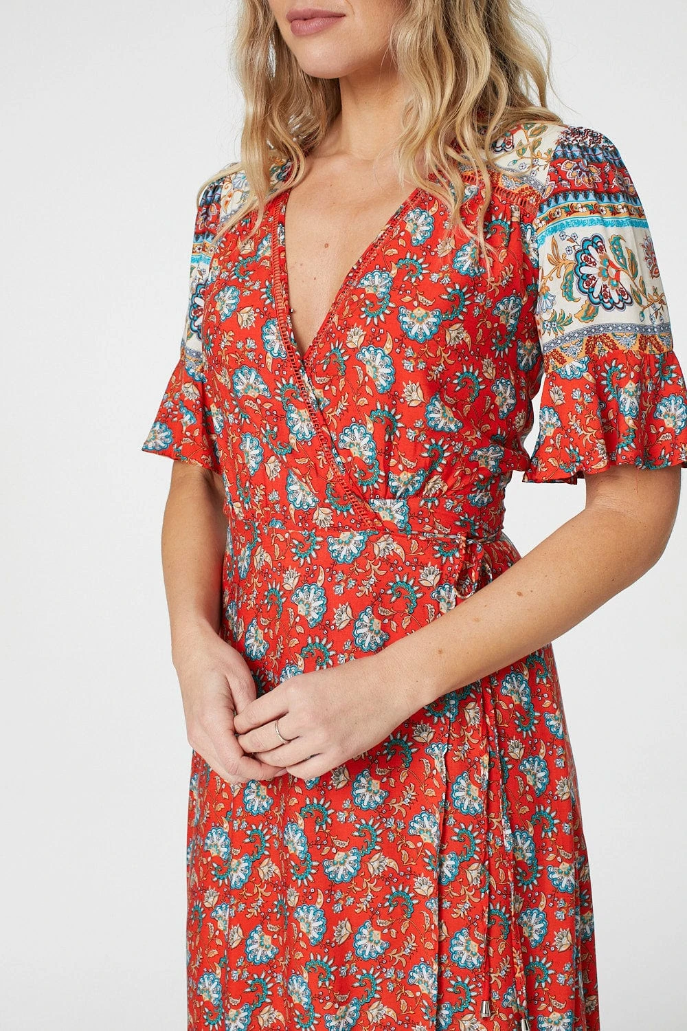 No collection is complete without a bold paisley printed wrap dress. With a v-neck, short sleeves, a tie detail waist and a tiered border print maxi skirt. Dress up with blush heels for a wedding guest look or dress down layered over skinny jeans and heeled espadrille wedges for a bold daytime look.
