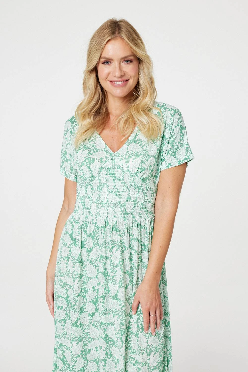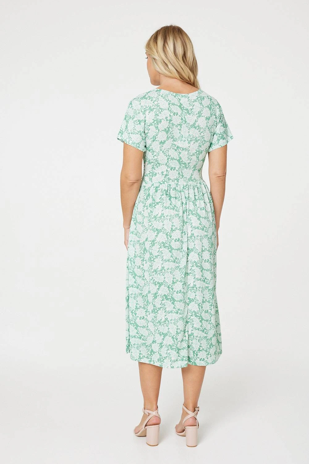 Add a versatile midi dress to your closet like this one. With a v-neck, short sleeves, a flattering shirred waist and a column-shaped midi length silhouette. Pair with blush heels for a chic daytime style you could wear for a lunch out with friends or even a warm season wedding.