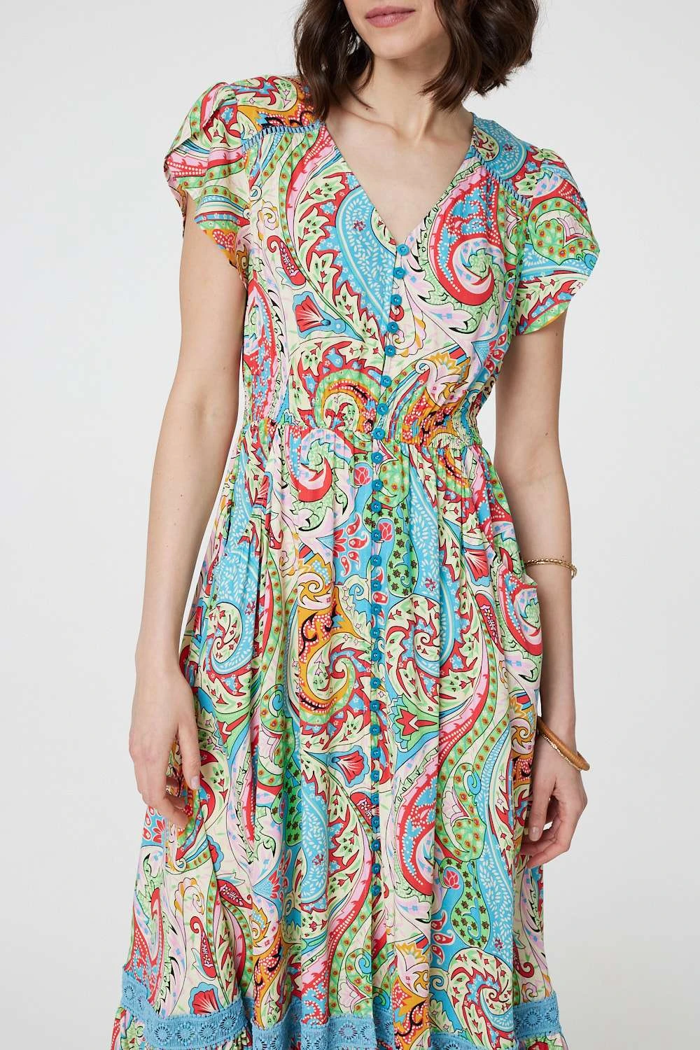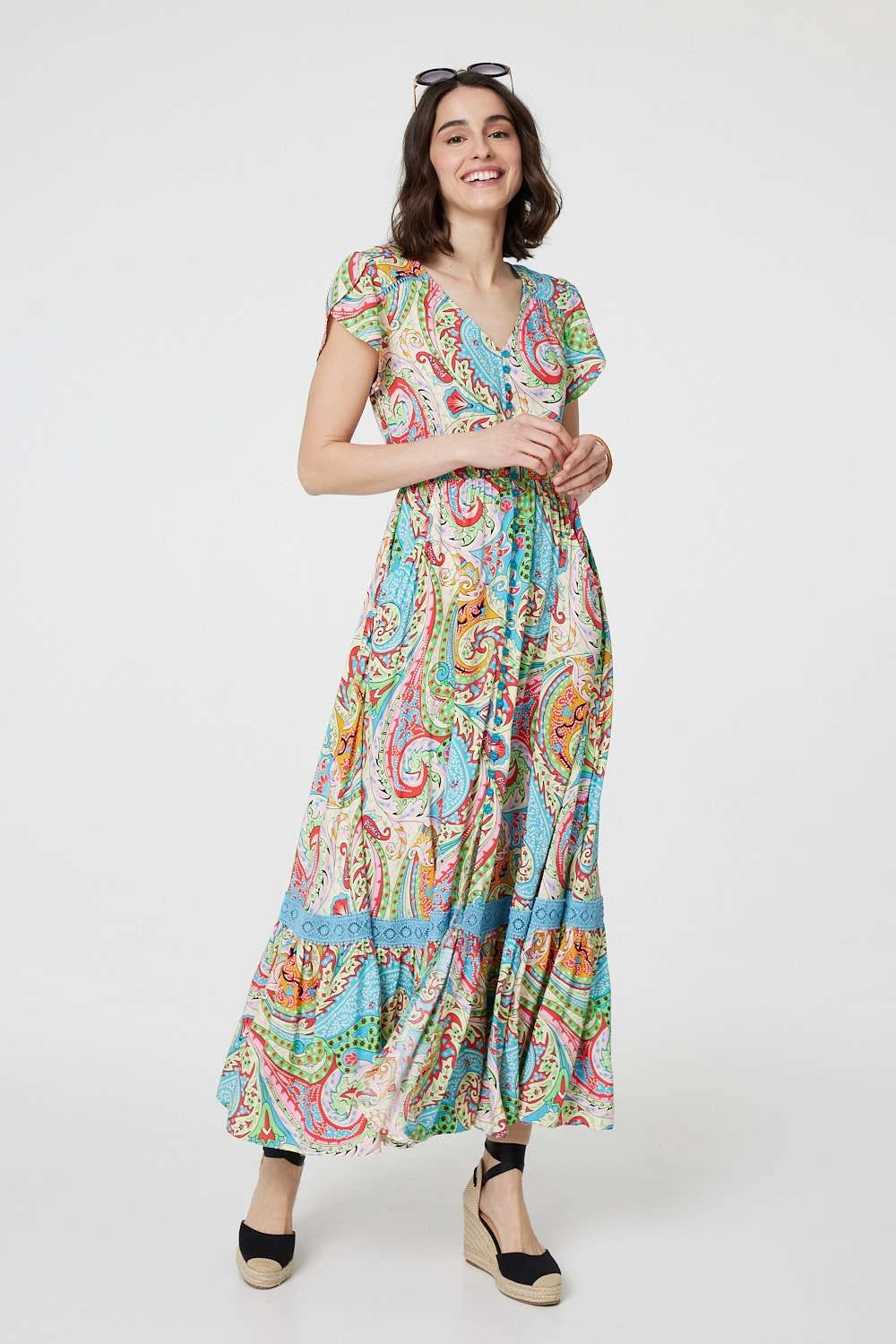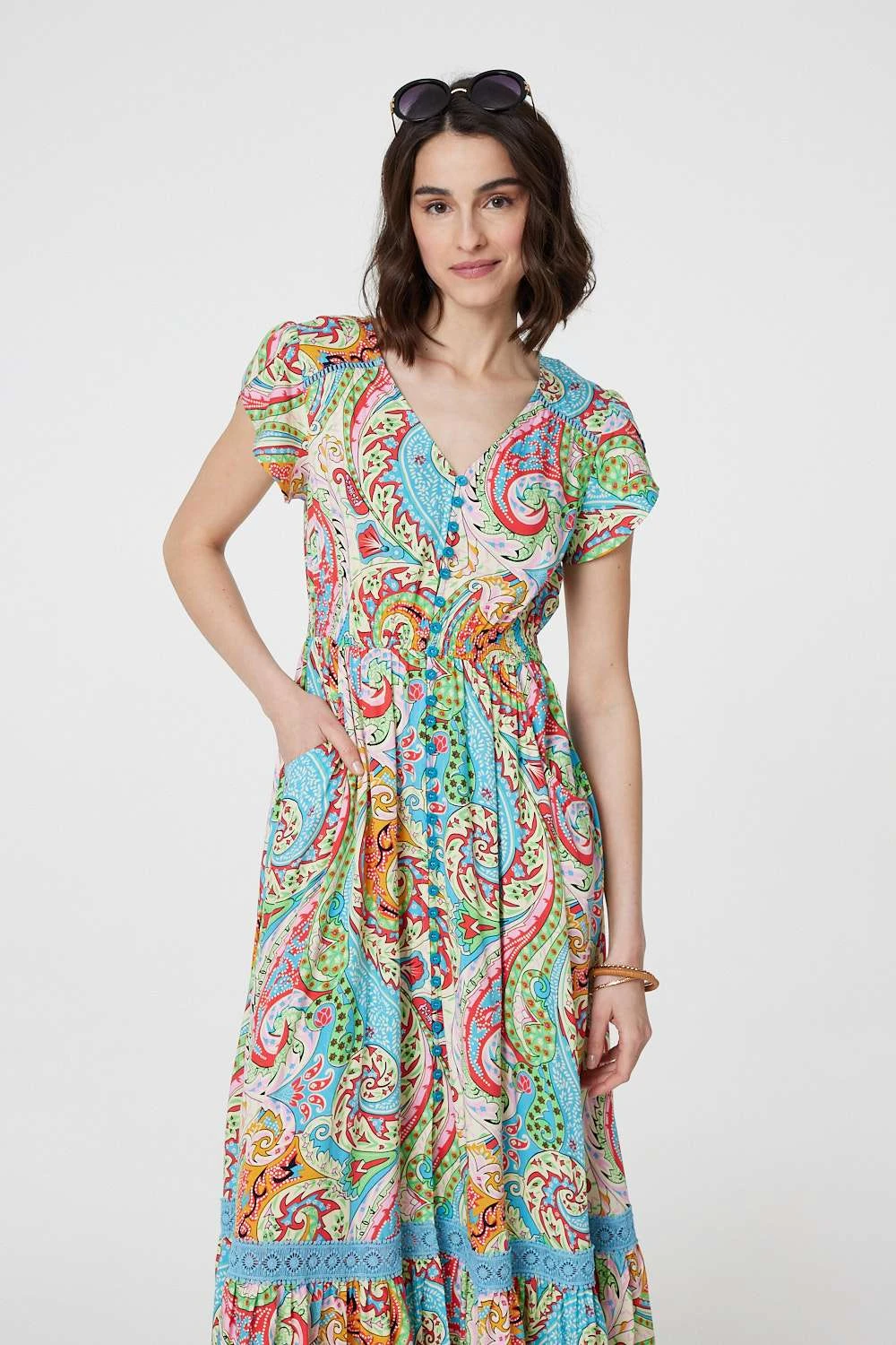 For a summery look that can be worn daytime and evening, try this maxi dress. It’s made from 100% viscose and has short angel sleeves, a v-neck and button details down the front. It also has a lace trim around the maxi skirt.