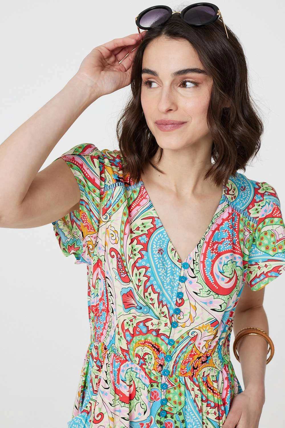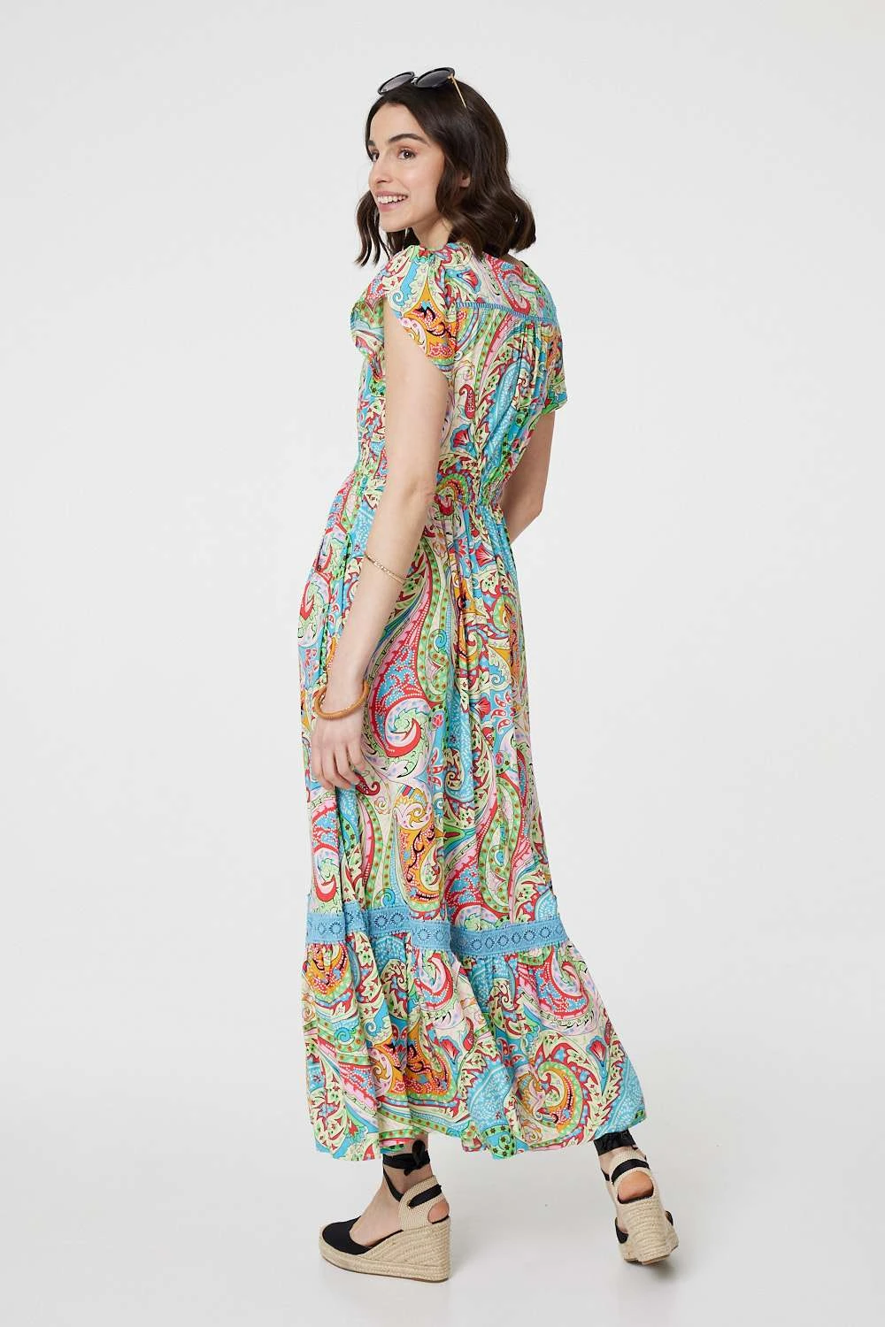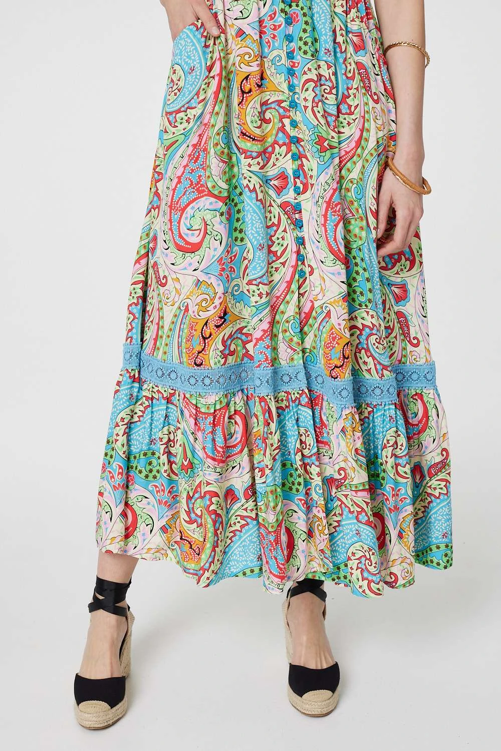 For a summery look that can be worn daytime and evening, try this maxi dress. It’s made from 100% viscose and has short angel sleeves, a v-neck and button details down the front. It also has a lace trim around the maxi skirt.