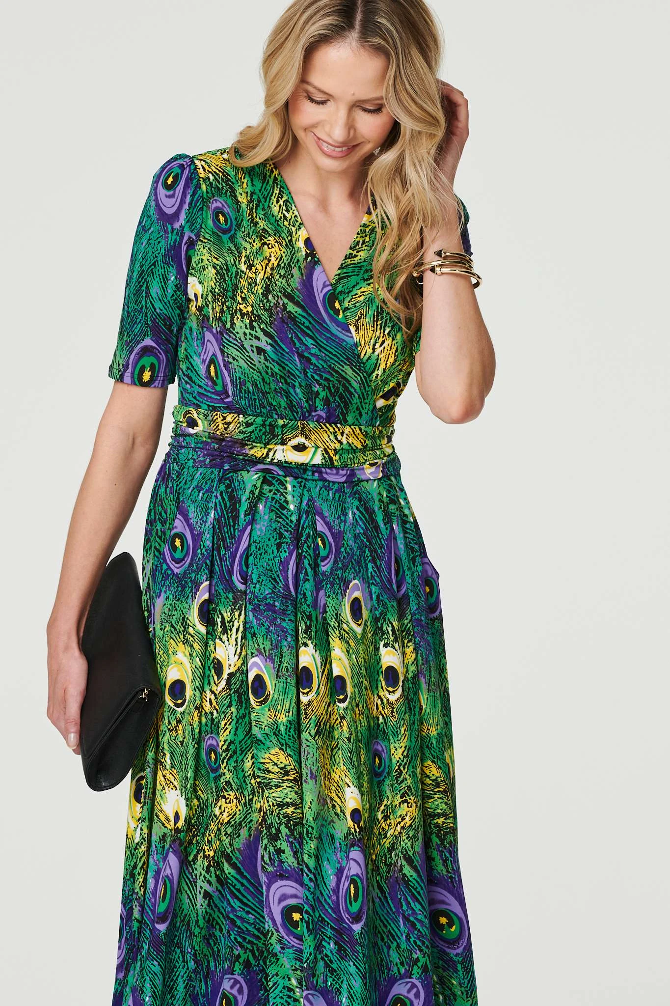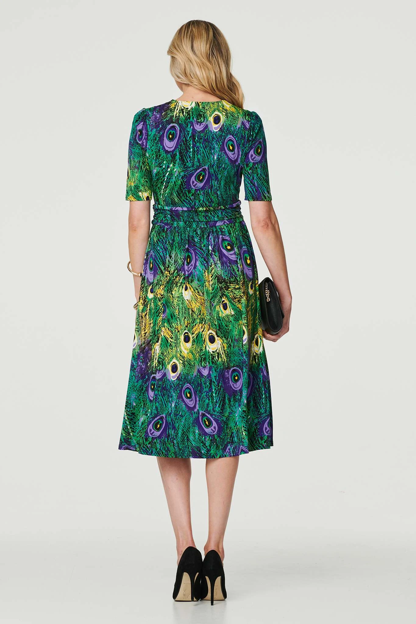 Make a statement with this beautiful peacock print dress. The ruched waist panel creates a flattering silhouette on all figures. This dress also has 1/2 sleeves, a v-neck and a sophisticated midi length hem.