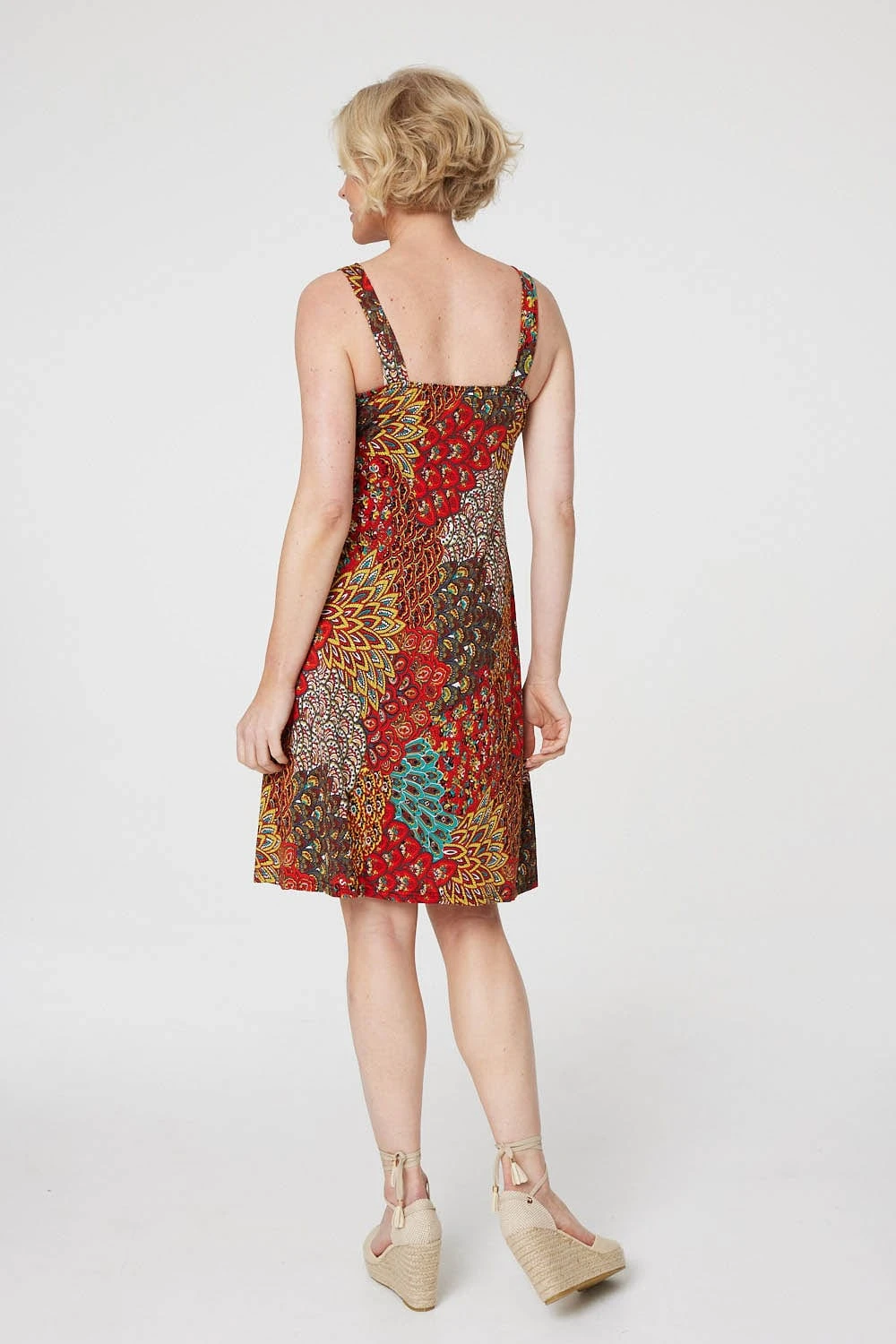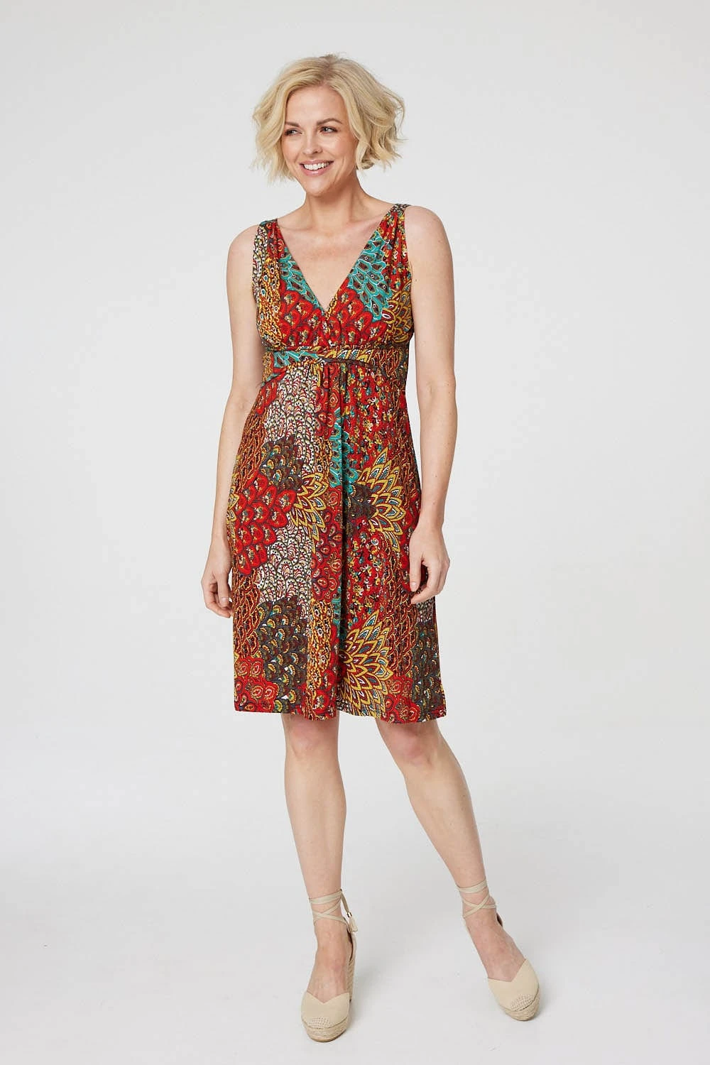 Add a statement colour to your warm weather dress collection with this peacock print sun dress. With a deep v-neck, thicker bra-friendly cami straps, a flattering empire waist seam detail and a straight knee length skirt. Pair with flat sandals and a cross body bag for a casual summer holiday ready look.