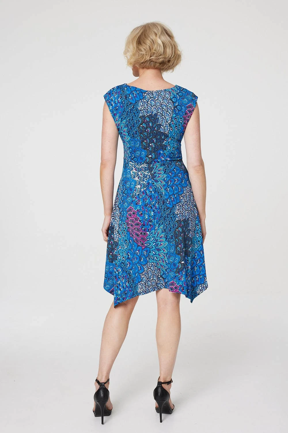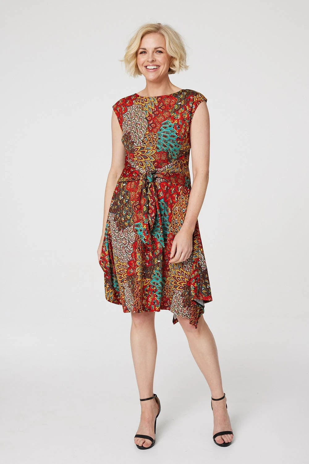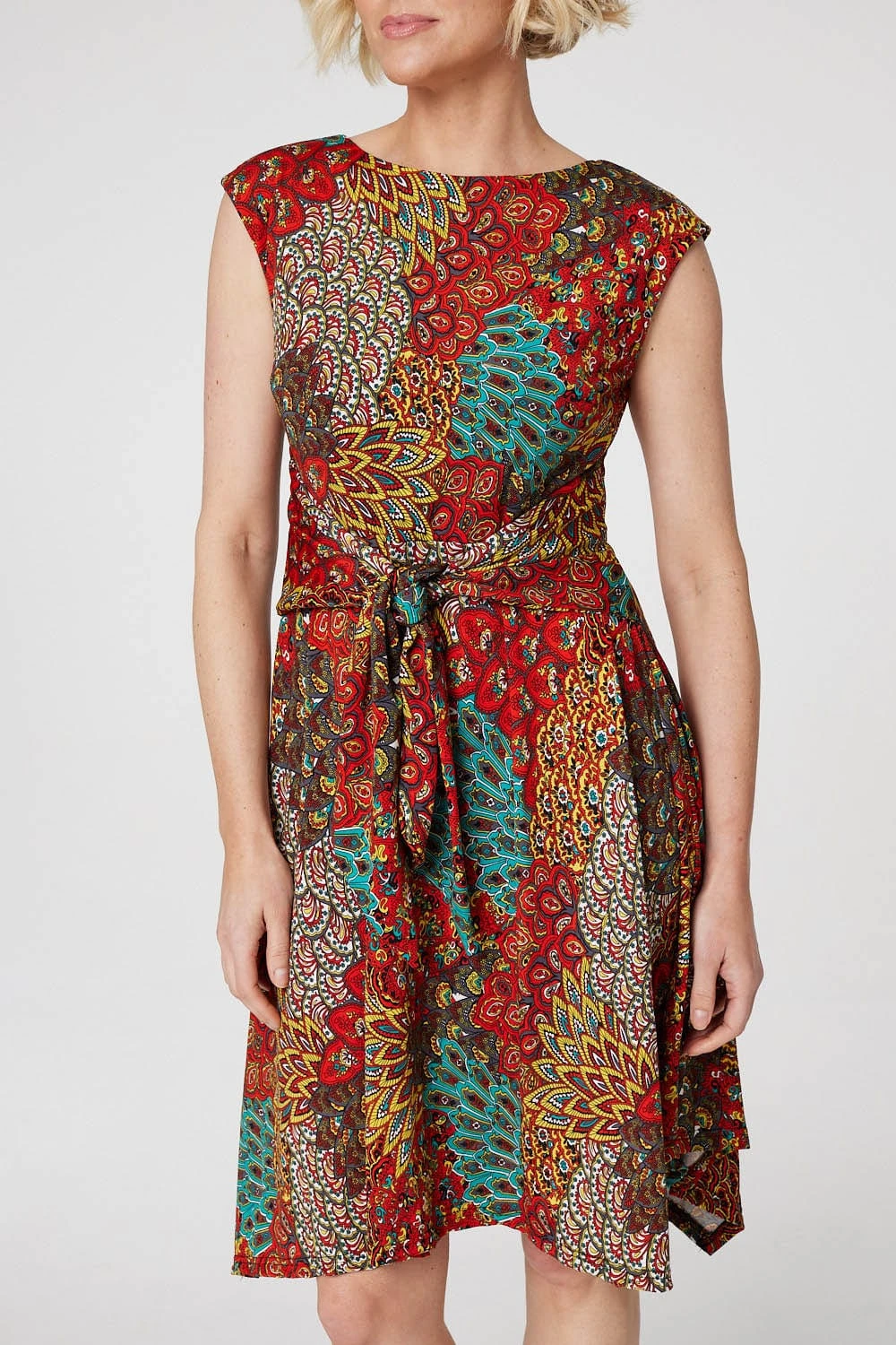 Add a statement print to your dress closet with this peacock print skater dress. With a round neck, a sleeveless fit, a tie detail front, a hanky hem skirt and a knee length hemline in a soft non-iron jersey fabric. Style with black heels and a small bag for an evening event or pair with low sandals and an oversized denim jacket for a casual daytime look.