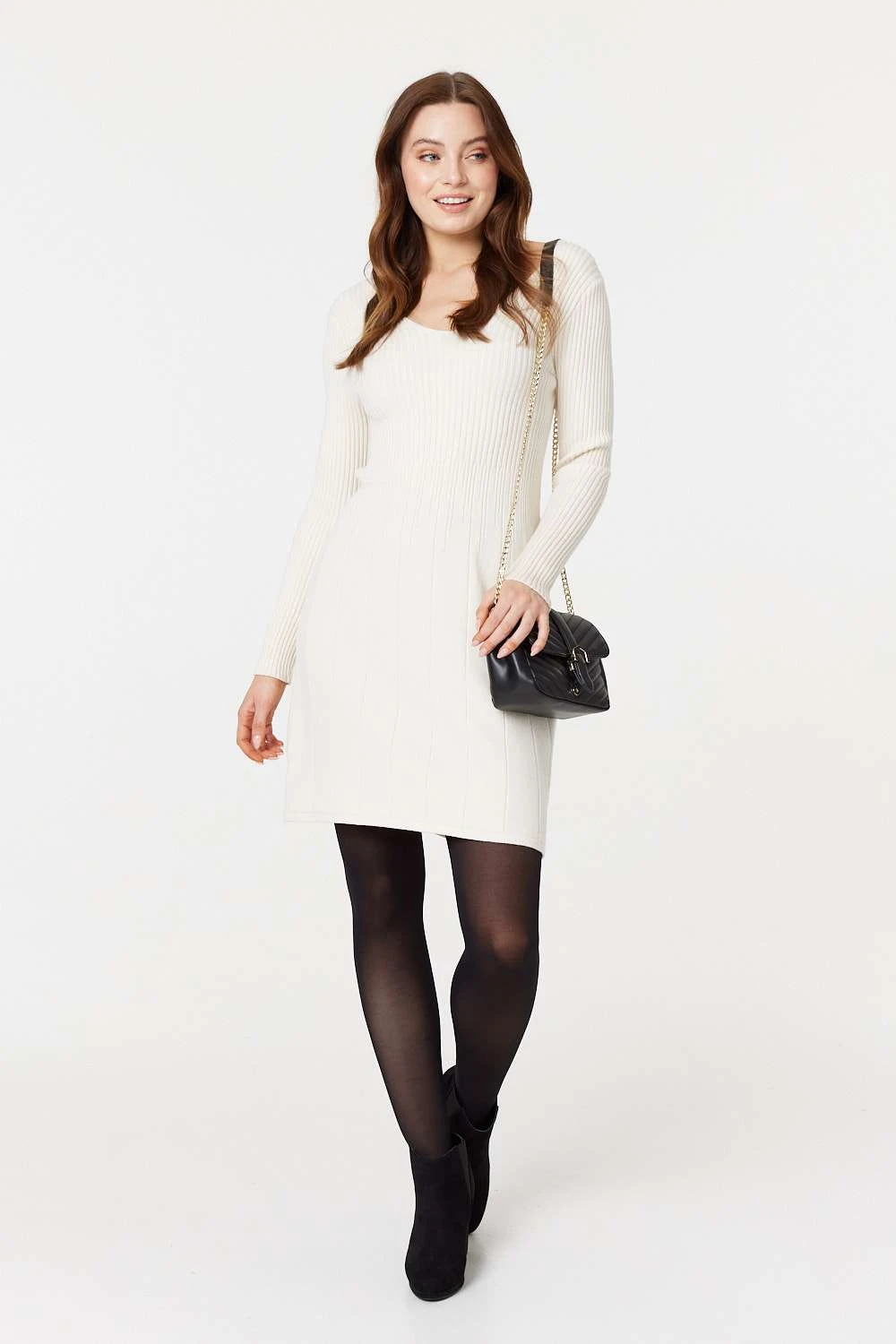 For easy layering and styling through the seasons, simple mini dress. It’s made from ribbed knit material with a round neck, long sleeves, a fit & flare shape and mini length hem. Layer up with tights and cardigans to style this dress right through to the cool days of winter.