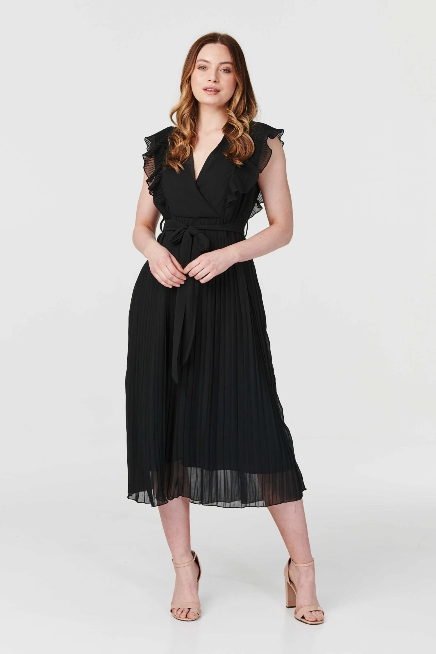 Make a sophisticated statement with this pleated midi dress. It has a v-neck with a wrap front, frilled cap sleeves, a self tie waist and a flattering pleat detail giving a chic longline silhouette. Pair with neutral heels for a standout style that’ll turn heads at any occasion.