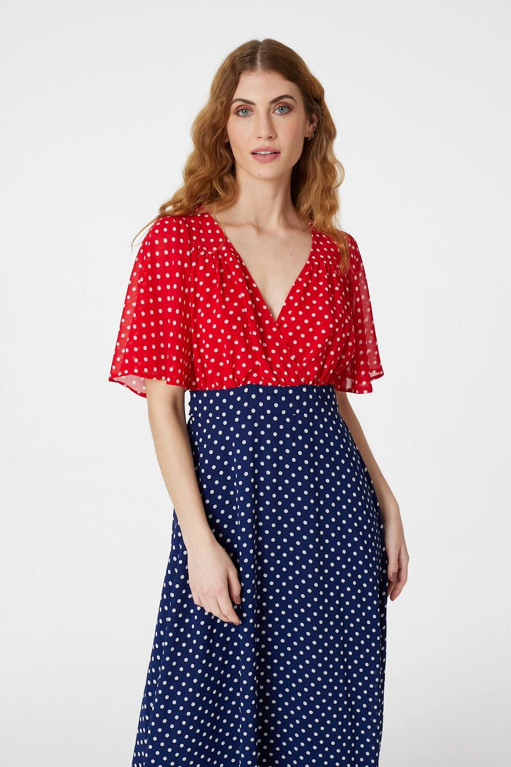 Every dress collection needs a flattering a-line dress like this polka dot maxi dress. With a v-neck, faux wrap front, semi sheer short flared sleeves, a tie detail back, a bold contrasting colour block detail and a classic full length skirt. Pair with silver heels for a formal daytime event or dress down with strappy sandals for sunny picnic.