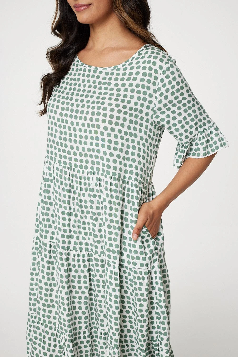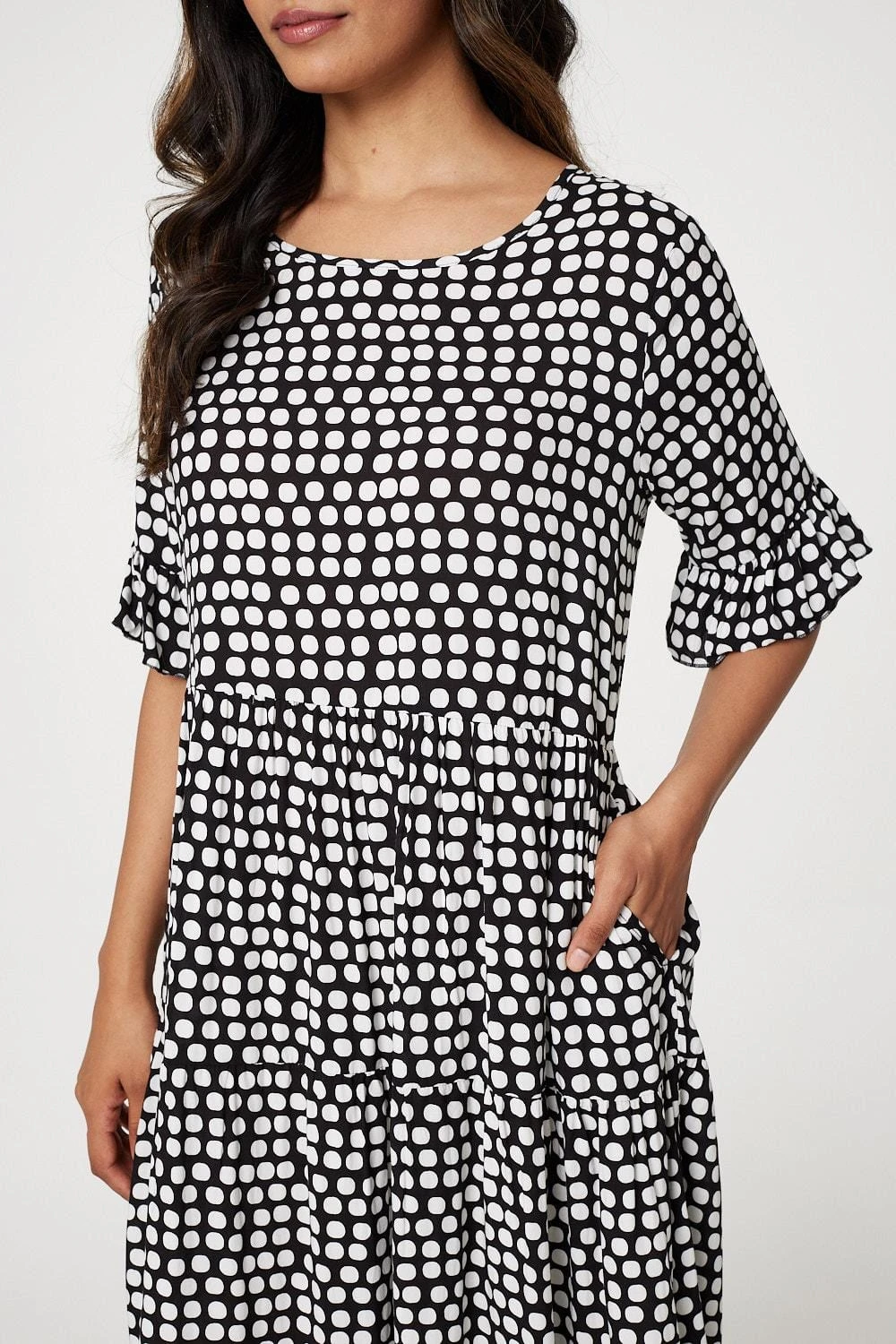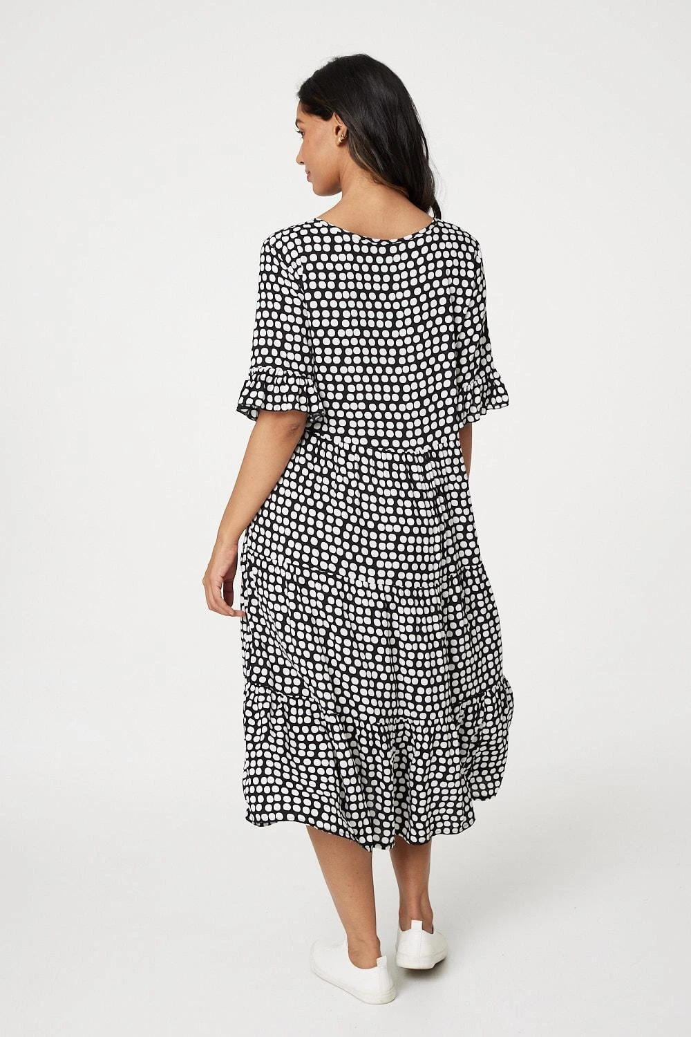 Add a striking polka dot print to your wardrobe with this flute sleeve midi dress. It has a round neck, 1/2 length sleeves with a pretty frill detail, a relaxed fit and a tiered midi length hem. Made from 100% viscose, it’s a great lightweight and breathable style for a warm day. Try pairing with heels in a bold shade for a pop of colour to contrast with this sharp monochrome look.