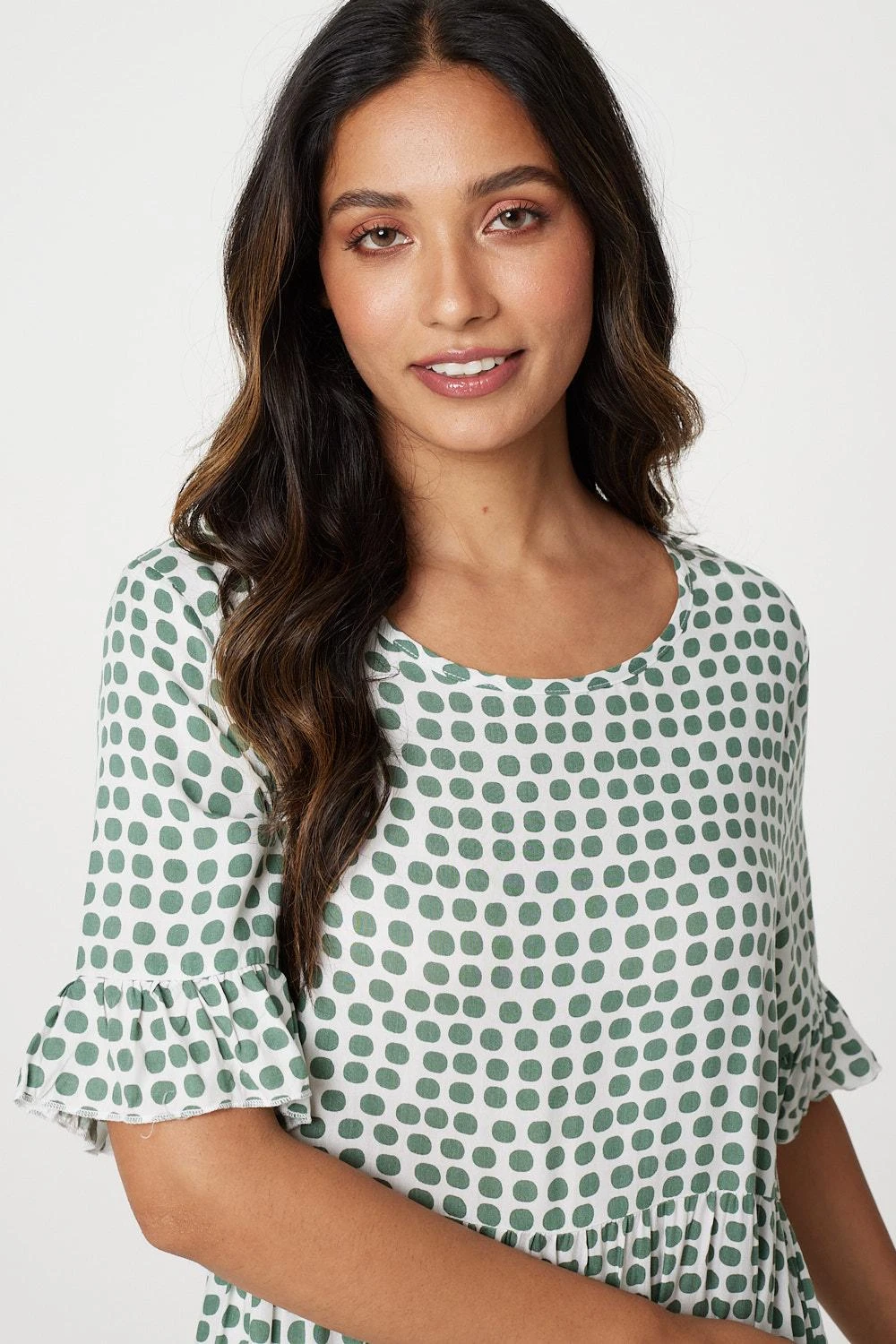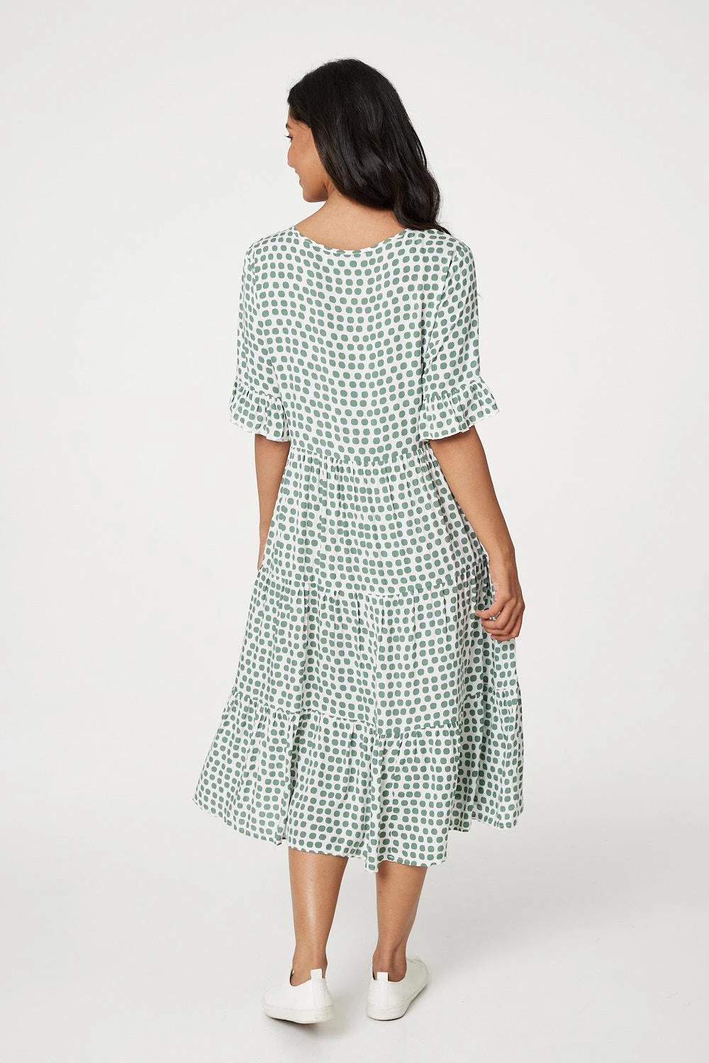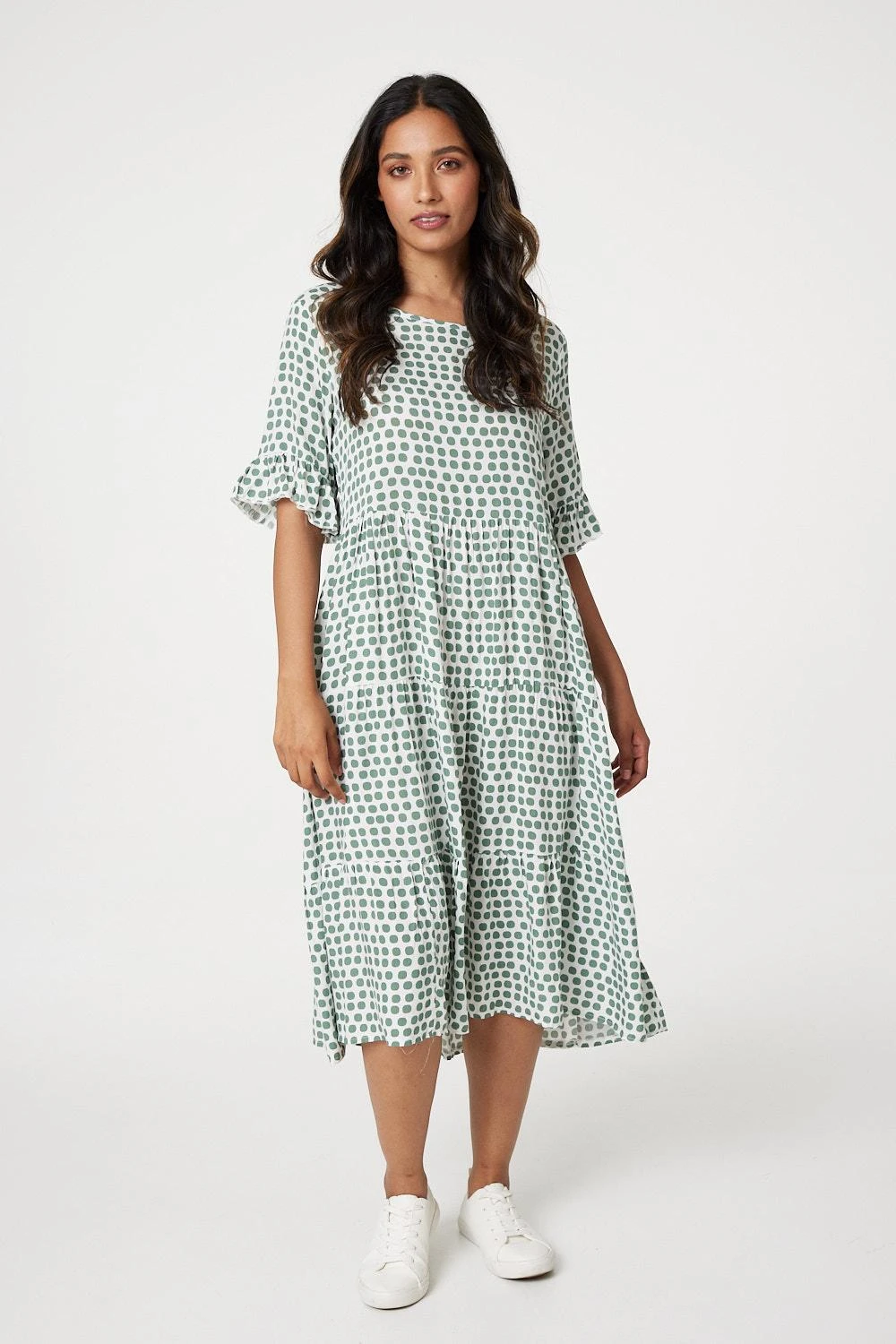 Add a striking polka dot print to your wardrobe with this flute sleeve midi dress. It has a round neck, 1/2 length sleeves with a pretty frill detail, a relaxed fit and a tiered midi length hem. Made from 100% viscose, it’s a great lightweight and breathable style for a warm day. Try pairing with heels in a bold shade for a pop of colour to contrast with this sharp monochrome look.