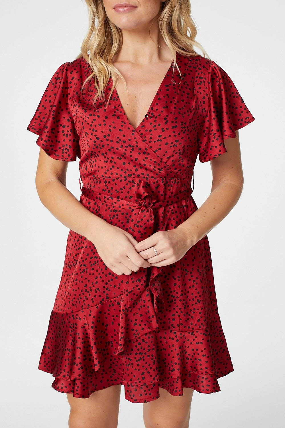 Stand out from the crowd in this bold polka dot wrap dress. With a v-neck, a wrap front, flared short sleeves, a tie detail waist and wrap effect frilled skater skirt sitting above the knee. Pair with black heels and matching clutch bag for the perfect girls night outfit.