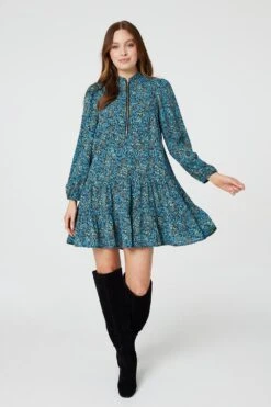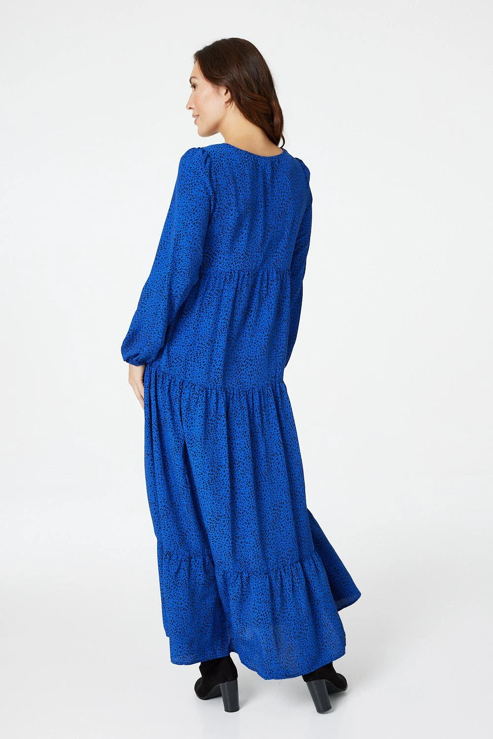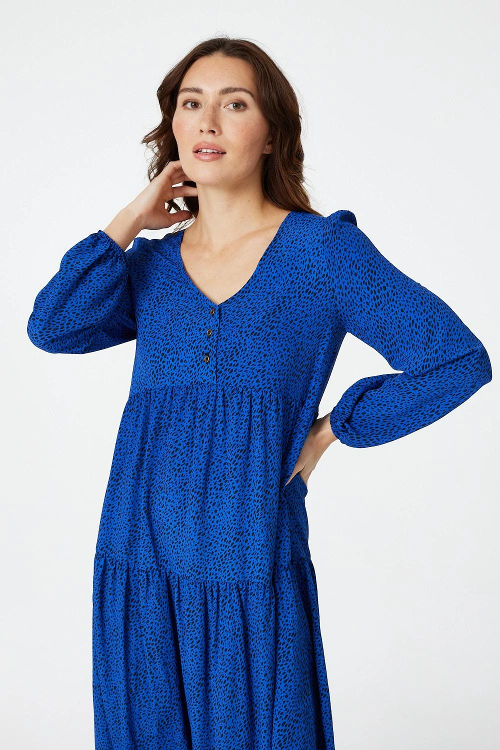 Add a comfortable everyday smock dress to your closet with this polka dot dress. With a v-neck, button details, long sleeves and a tiered midi skirt. Style with strappy heels for a polished yet comfortable outfit or dress down with trainers.