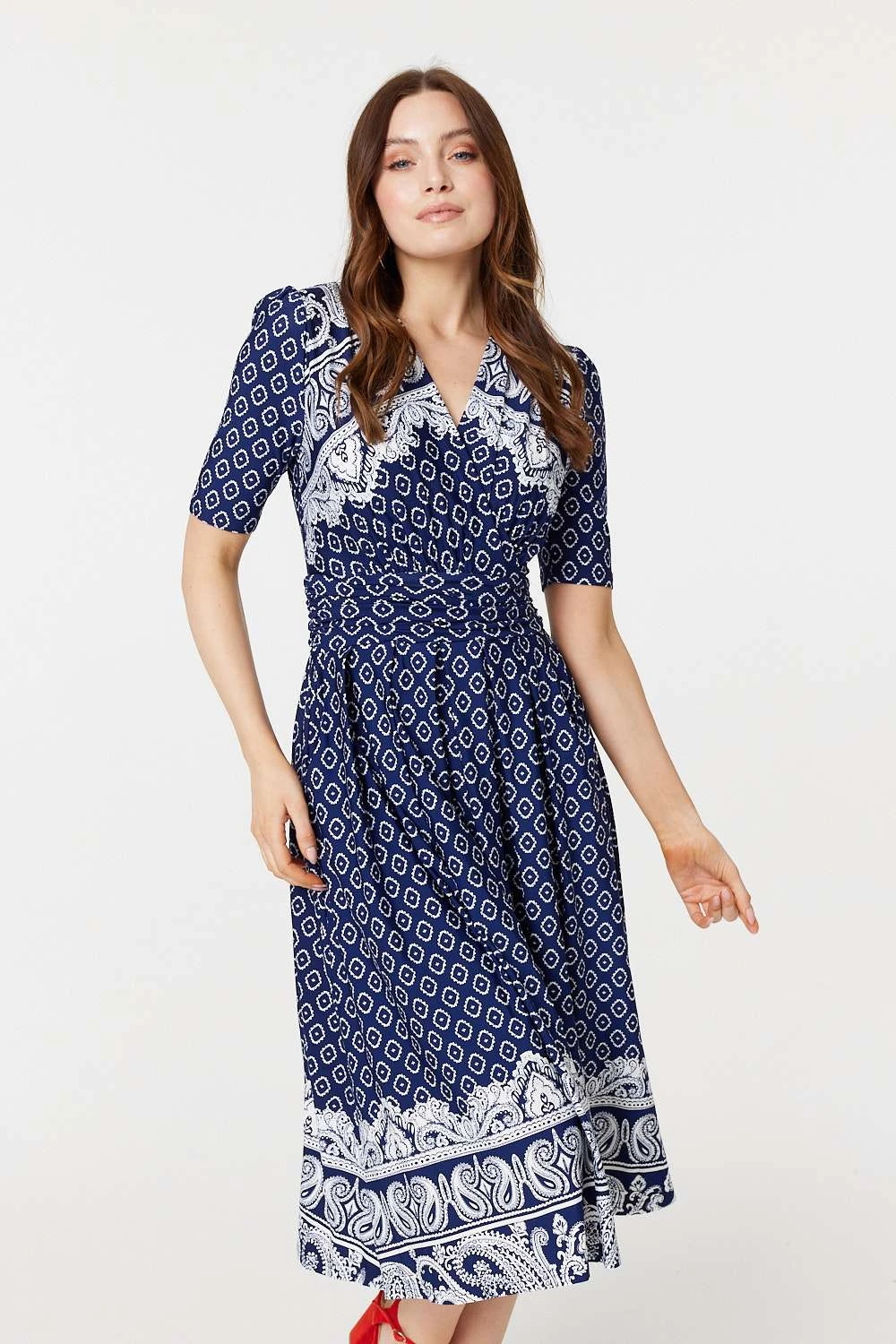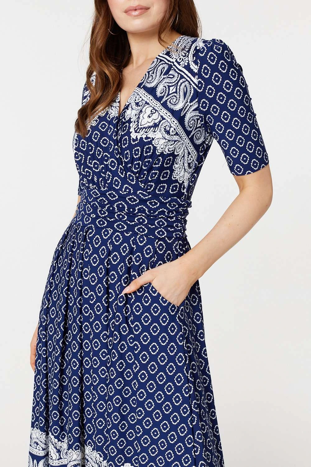 Add a straight silhouette to your dress collection with this printed midi. It has a v-neck, 1/2 length sleeves, a wrap front and a column-shape midi length skirt. Made in a non-iron stretch jersey fabric it’s the perfect style to grab-and-go when you need to elevate your look fast! Pair with sandals or block heels to complete your ensemble.