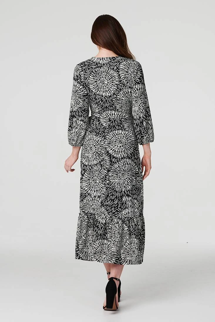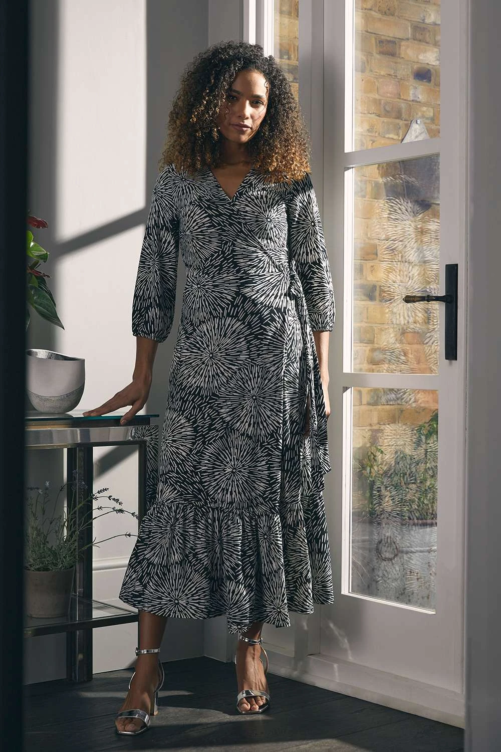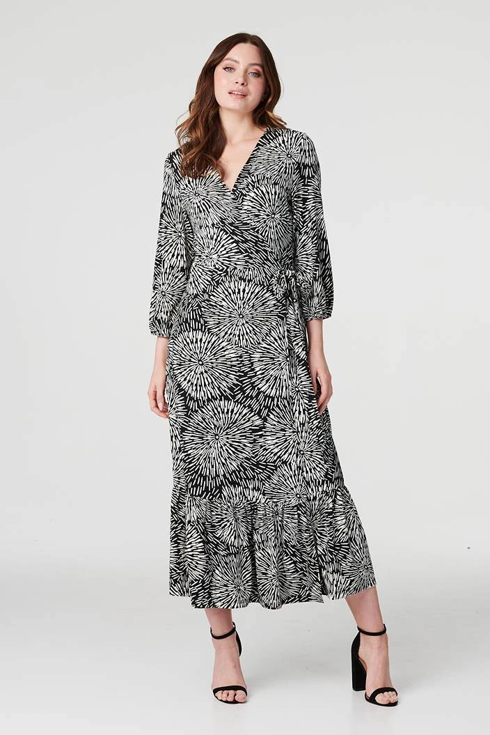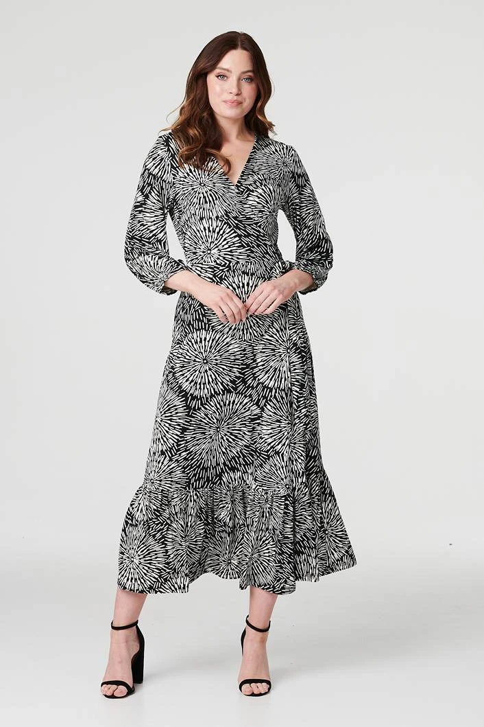 Look and feel confident wearing this classic midi wrap dress. It has a v-neck, 3/4 puff sleeves, a tiered midi skirt and a tie waist. Style it for an evening event by pairing with your favourite heels and jewellery, or dress down for a day at work with trainers and a cardigan.