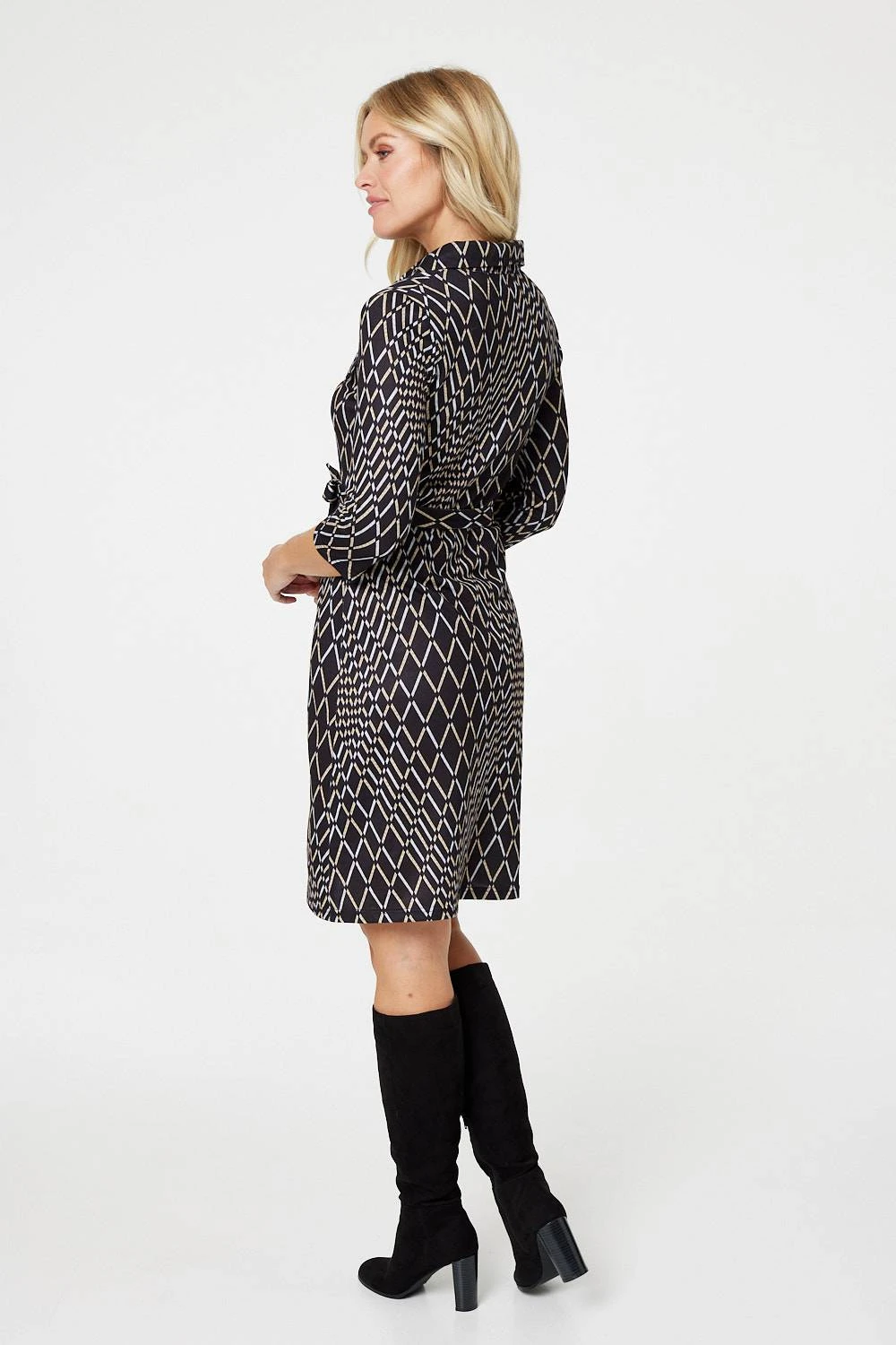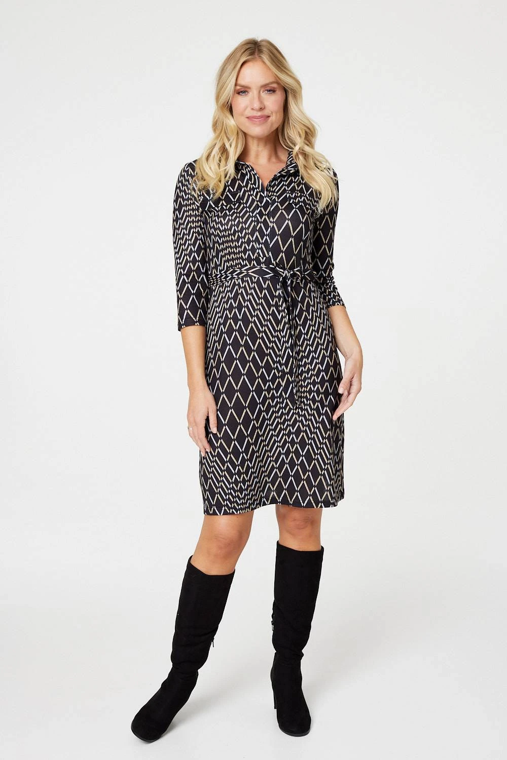 Add a statement print to your dress collection in this standout shirt dress. It has a collar, v-neck, 3/4 sleeves, a self-tie belt, a fitted straight silhouette and a short hem sitting just above the knee. Pair with boots and an elegant longline coat for a chic style that’s perfect for a day at the office or an evening out with friends.